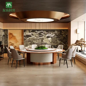 This Private Room Round Dining Table Set features a refined modern Chinese style blended with contemporary elegance. The natural wood finish, clean lines, and soft neutral upholstery create a warm, sophisticated atmosphere. Ideal for private dining rooms, upscale Chinese restaurants, and hotel VIP rooms.
