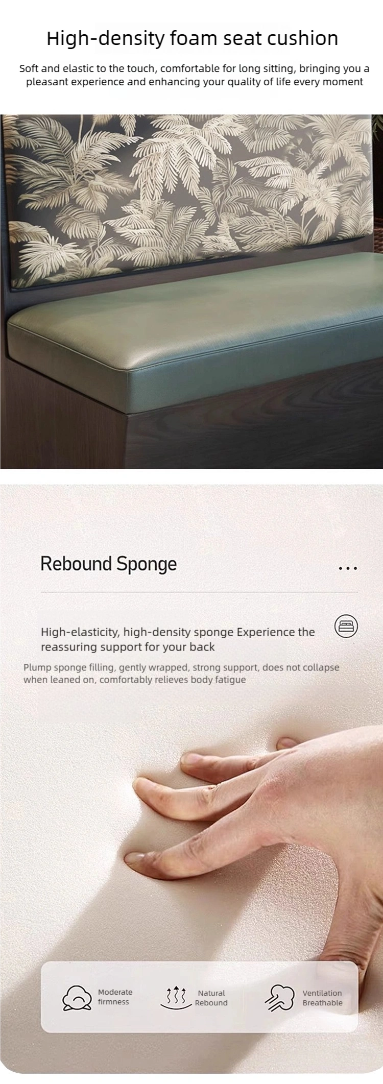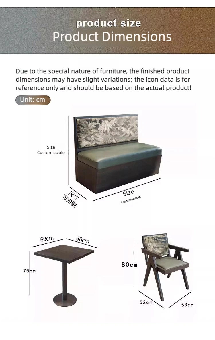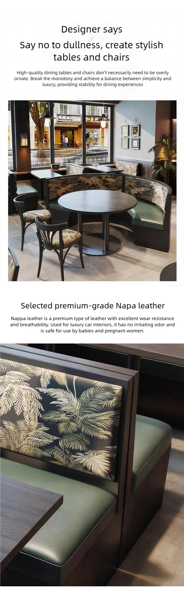 Wholesale black high-end restaurant furniture. The clean lines and sturdy construction showcase exceptional craftsmanship, creating a sophisticated and substantial feel. The dining table frame features a robust, solid wood structure made from carefully selected high-quality wood, while the chairs and booths utilize high-quality wooden frames and comfortable, durable leather upholstery, ensuring long-lasting use.