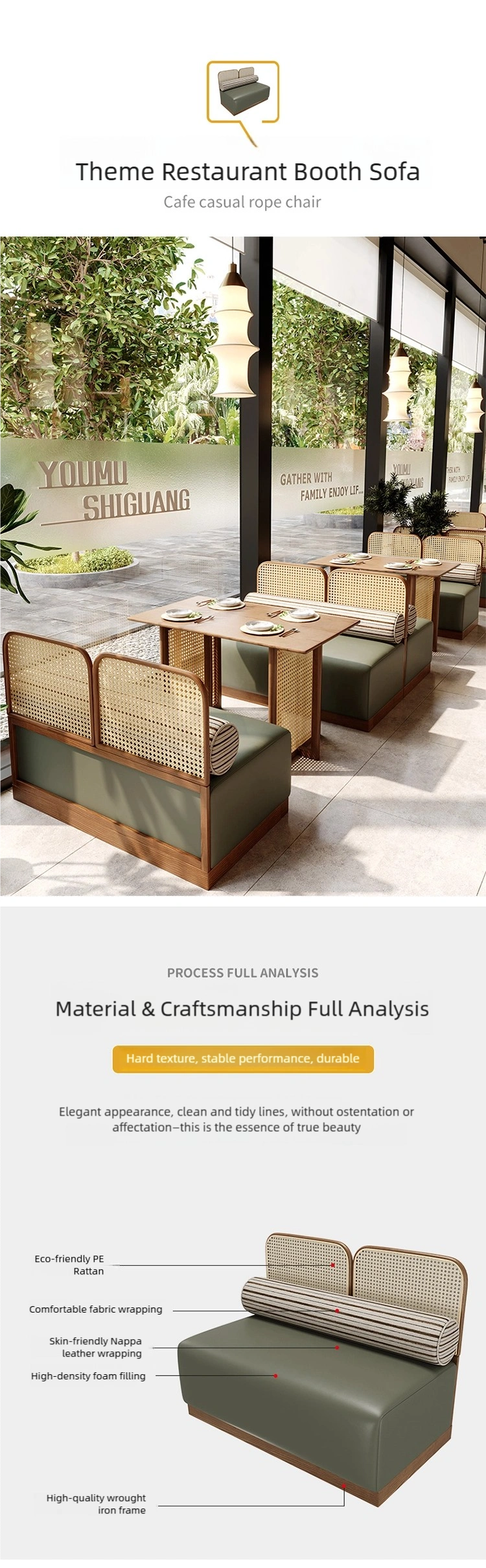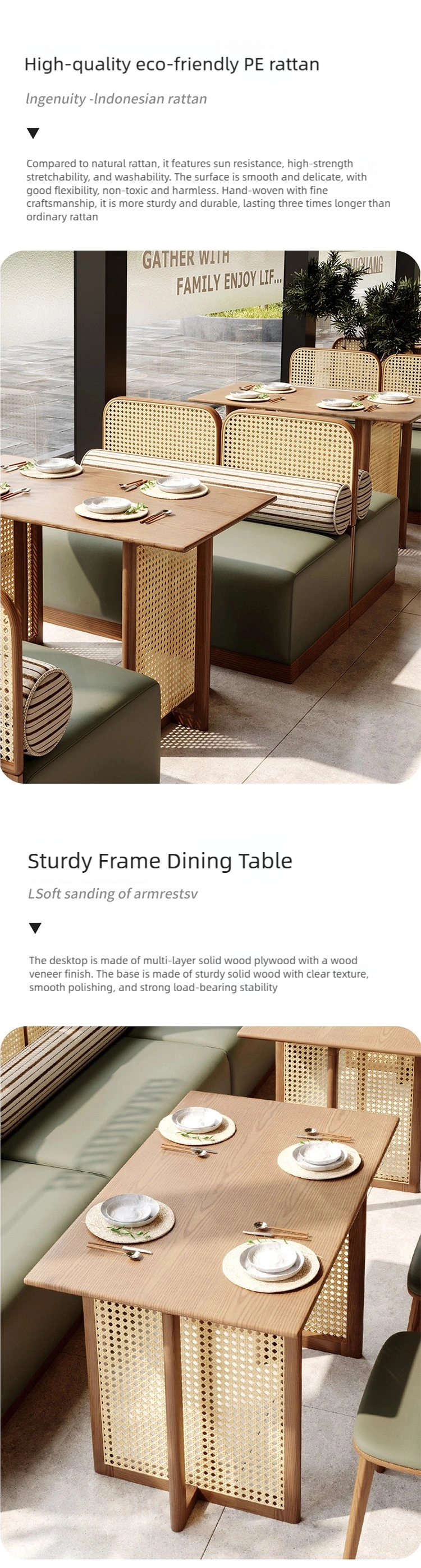 Southeast Asian Style and Rattan Design: Both booths and chairs feature wooden frames and rattan backrests, making them not only aesthetically pleasing but also sturdy and durable.