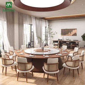 Enhance your banquet hall, VIP room, or hotel private dining space with this Round Rotating Dining Table Set with Matching Chairs – Factory Direct Sale. Designed to combine luxury aesthetics with practical functionality, this set features a spacious round table with a smooth rotating center (Lazy Susan), allowing effortless dish sharing and an elevated dining experience for guests.