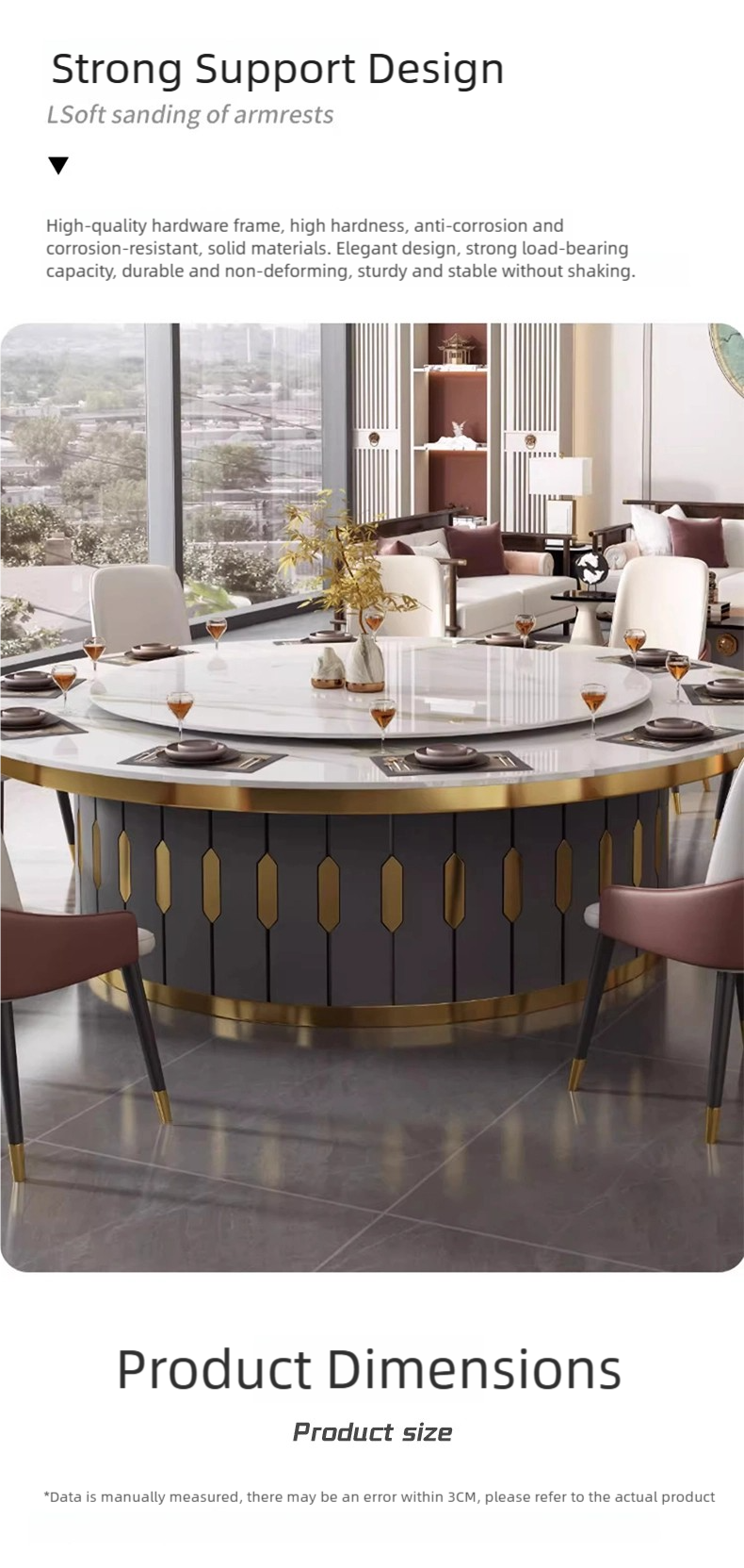 - Balanced Modern Luxury Color Palette: A clean white foundation of our dining table set for a banquet is elevated with gold metallic highlights and deep gray structural elements, creating visual harmony. Select variations introduce pink-and-white leather or black-and-gold leg accents for layered sophistication.