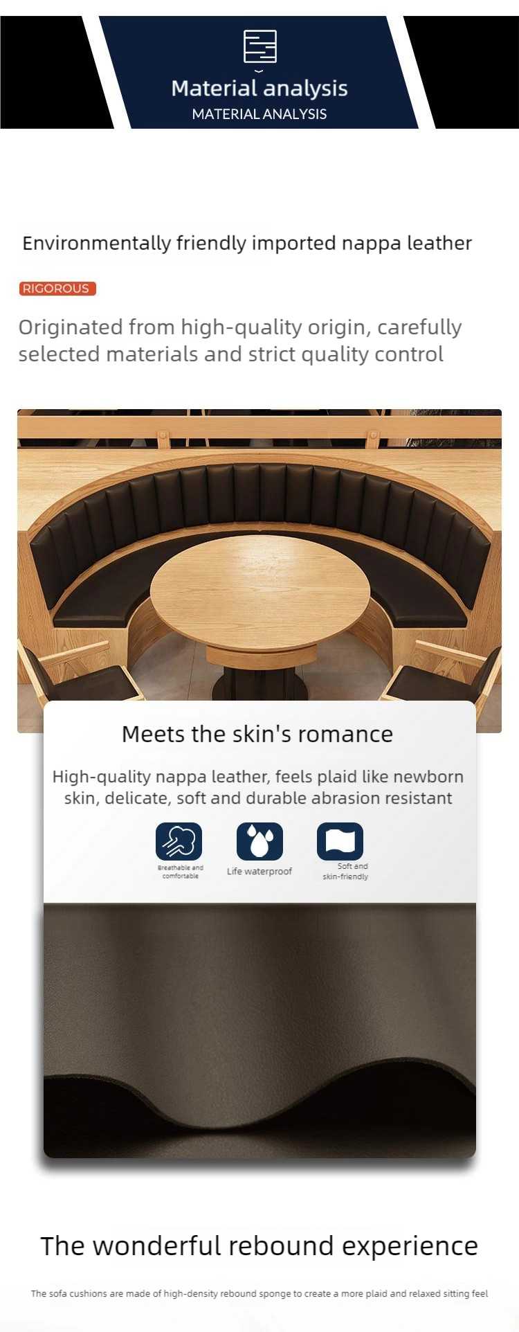 | Booth | Multi-layer solid wood frame + skin-friendly Nappa leather wrapping + high-density rebound sponge |