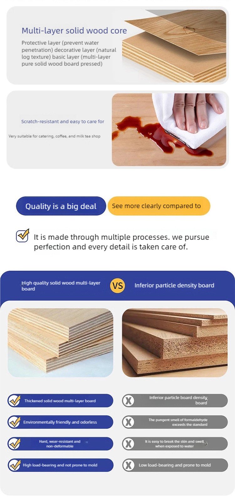 | Table | Multi-layered plywood tabletop + high-quality hardware table legs |