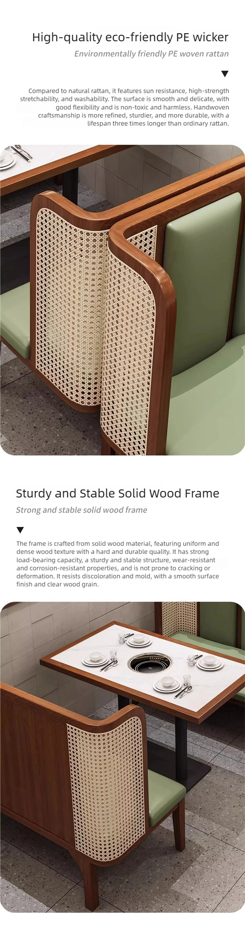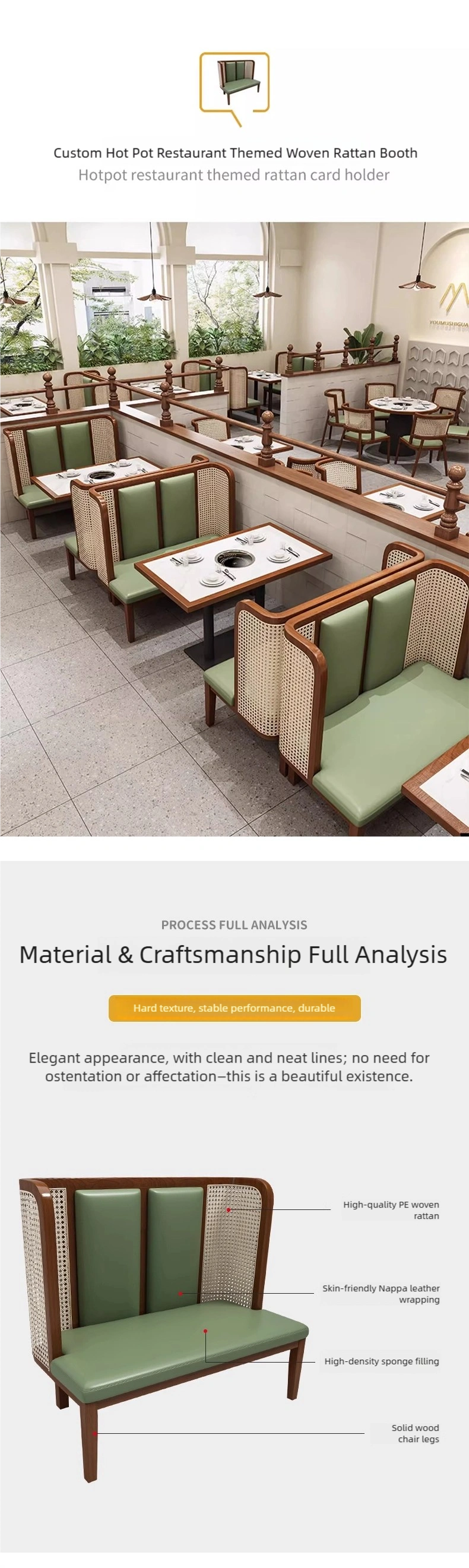 | Booth | Solid wood woven rattan frame + Eco-friendly Nappa Leather + High-density Resilient Foam |