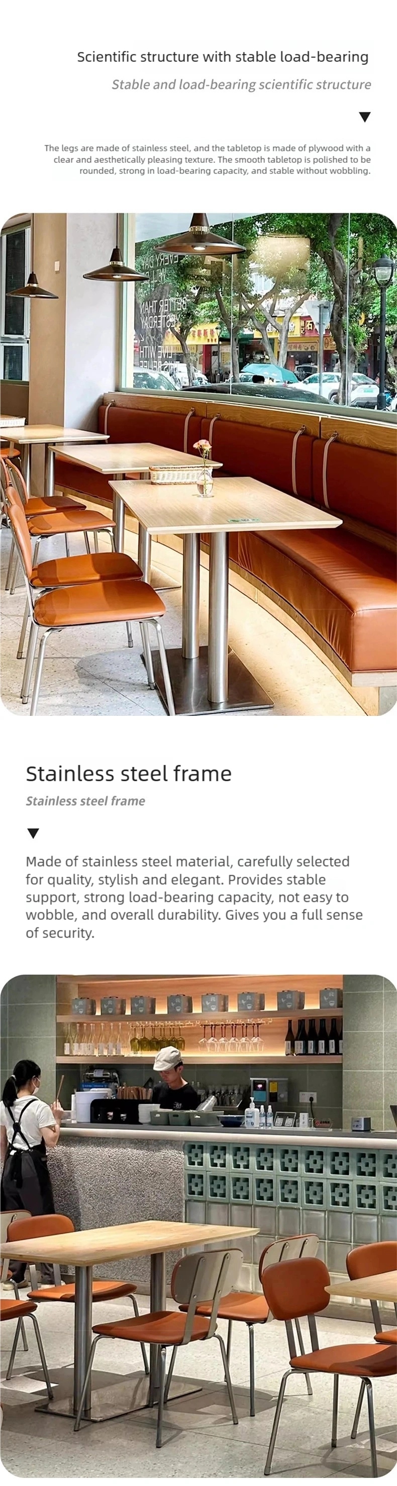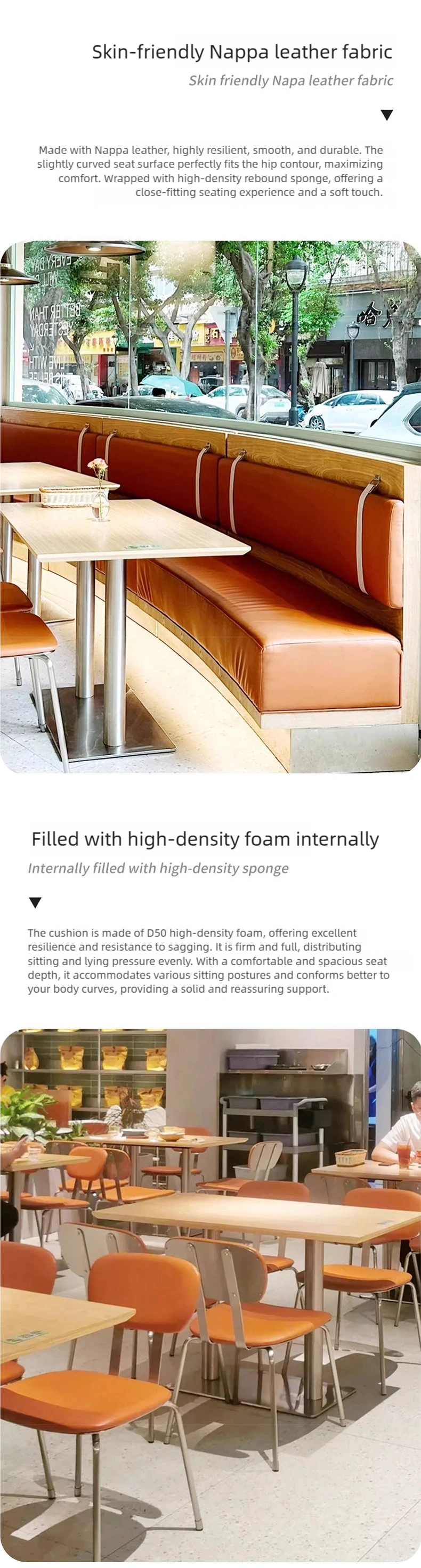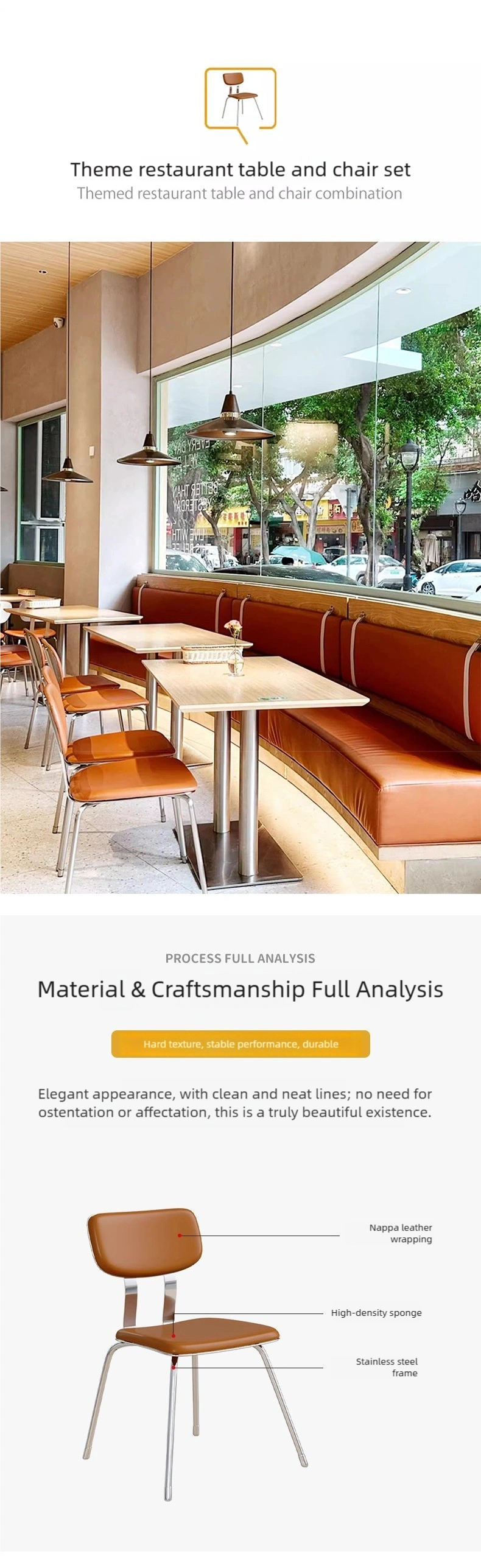 | Booth | Stainless steel base frame + premium Nappa leather + high-density sponge + multi-layer plywood frame |