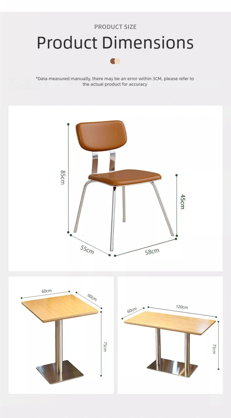 Wholesale themed restaurant furniture sets suitable for commercial spaces. The dining tables feature sturdy metal bases and wooden tabletops; the chairs boast high-quality stainless steel frames and comfortable, durable leather upholstery. This collection is ideal for themed restaurants. Bulk orders are welcome.