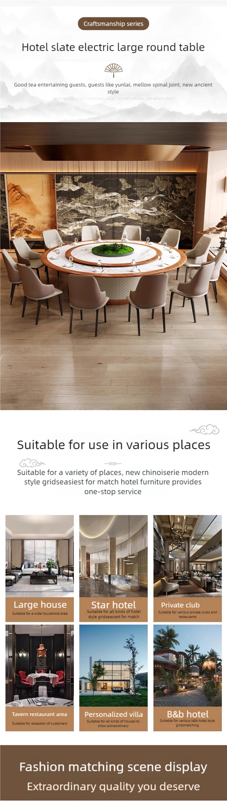 - Elegant and Luxurious Appearance: The round shape, premium finishes, and modern Chinese-inspired design enhance the overall atmosphere, making it perfect for upscale banquet hall furniture settings.