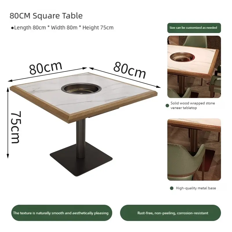Wholesale hot pot restaurant furniture is specially designed for hot pot and BBQ dining spaces. These dining tables feature a durable structure with built-in induction cookers, ensuring a safe, convenient, and enjoyable dining experience. As a restaurant furniture manufacturer, we offer furniture in various styles, sizes, and materials, and can fully customize furniture according to the theme of your restaurant to create a comfortable and efficient dining environment.