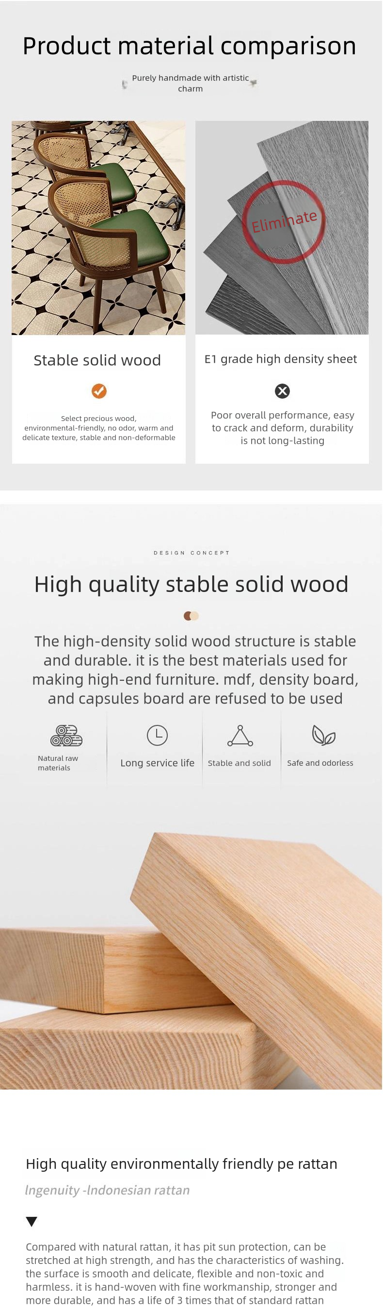 | Chair | Solid wood woven rattan frame + Eco-friendly Nappa Leather + High-density Resilient Foam |