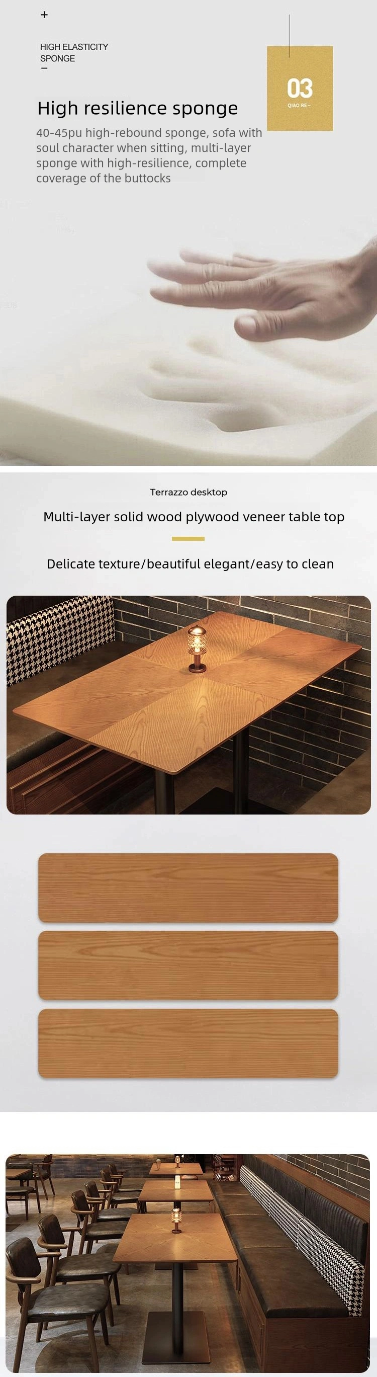 | Booth | Multi-layer solid wood frame + skin-friendly Nappa leather wrapping + high-density rebound sponge |