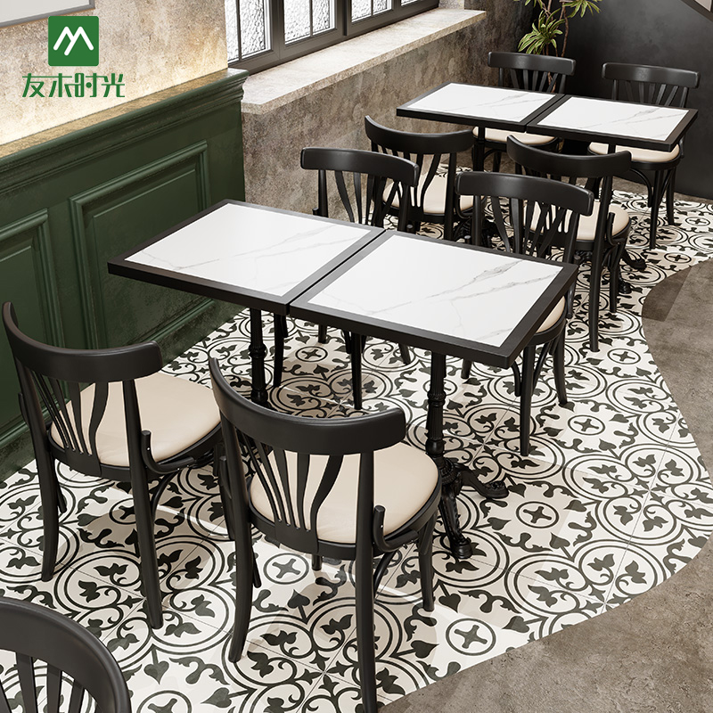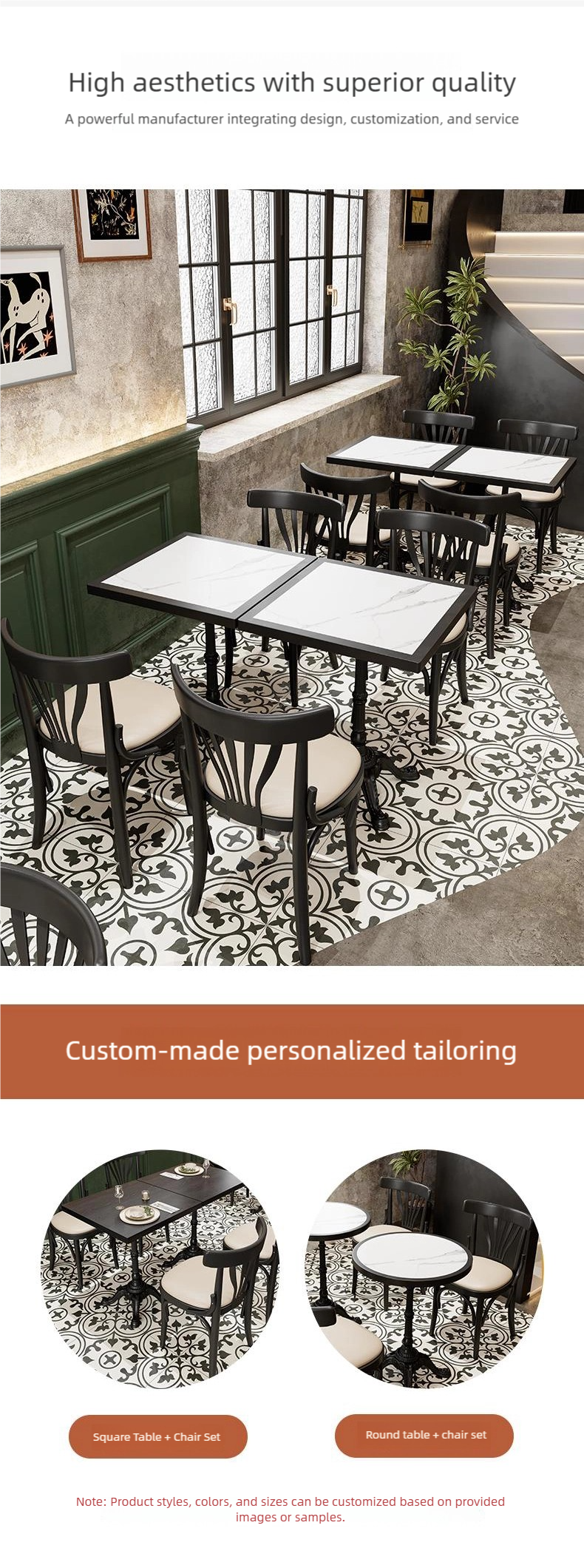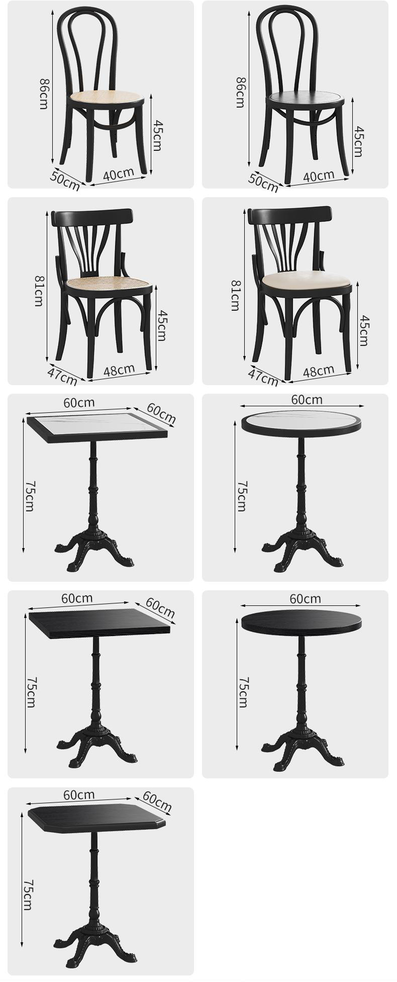 Wholesale cafe tables and chairs. This cafe furniture features a classic, vintage European cafe style. This product series is designed to create an atmosphere where every cup of coffee is worth savoring and every conversation is memorable. Contact us for factory pricing.
