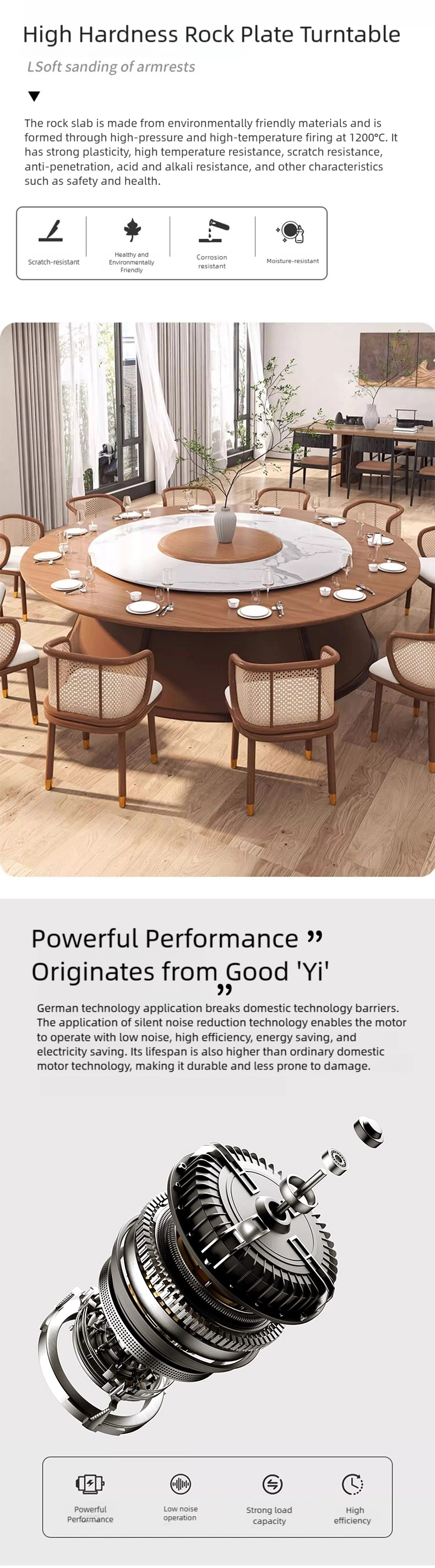 Practical and Convenient: The smoothly rotating tabletop, quiet motor, and ergonomic chair ensure maximum dining comfort and efficiency.