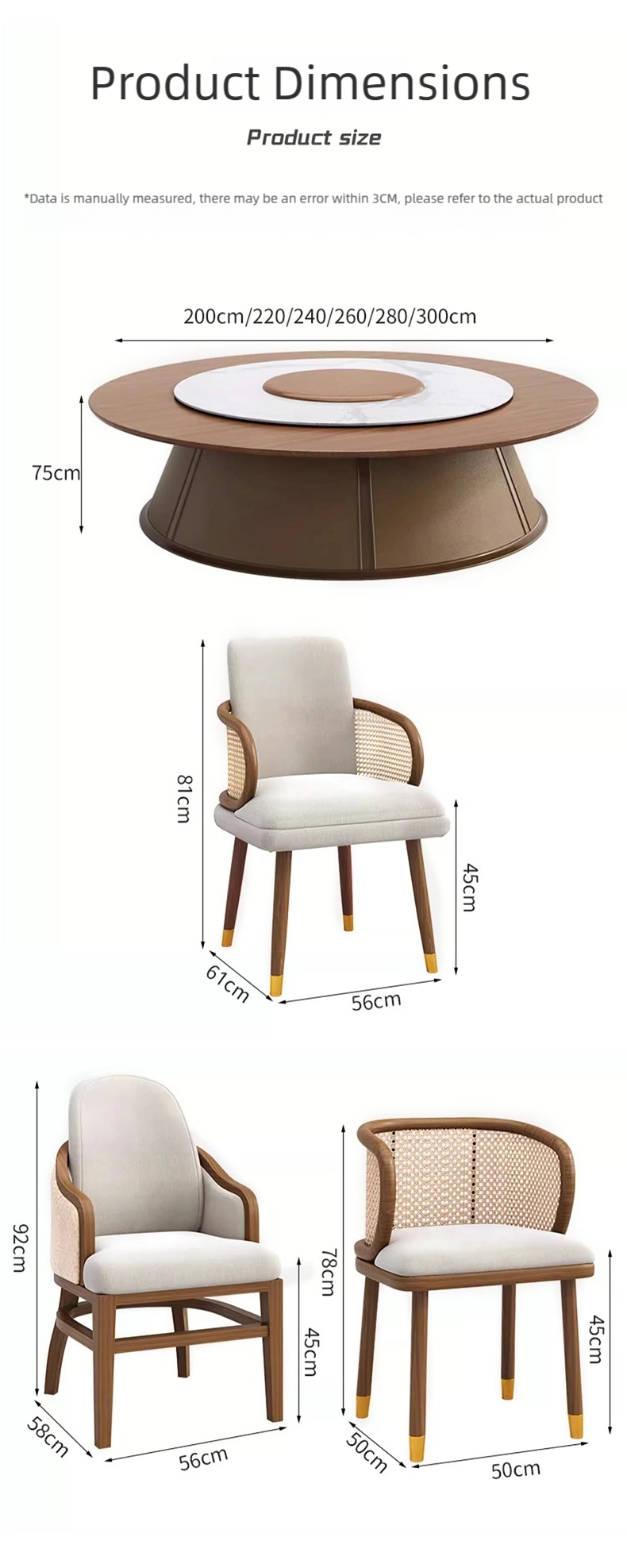 As a hotel round table set manufacturer, Youmu Shiguang Furniture’s wholesale banquet hall furniture collection helps you elevate your banquet hall, wedding venue, or hotel dining space. We offer seven sizes of hotel round tables: 180cm, 200cm, 220cm, 240cm, 260cm, 280cm, and 300cm, ensuring you can find the perfect fit for any event or seating arrangement.