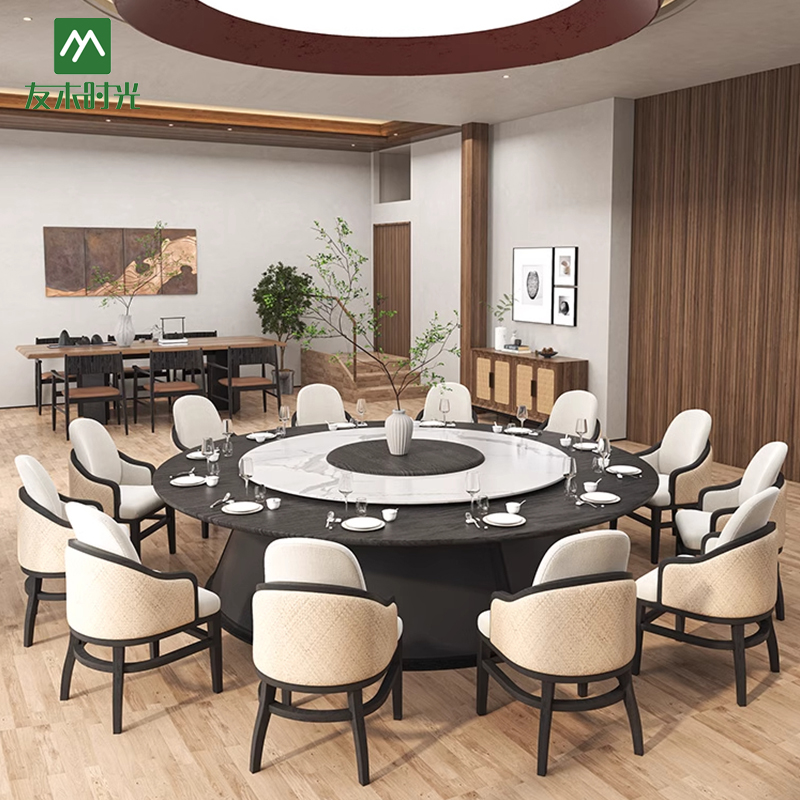 This Private Room Round Dining Table Set features a refined modern Chinese style blended with contemporary elegance. The natural wood finish, clean lines, and soft neutral upholstery create a warm, sophisticated atmosphere. Ideal for private dining rooms, upscale Chinese restaurants, and hotel VIP rooms.
