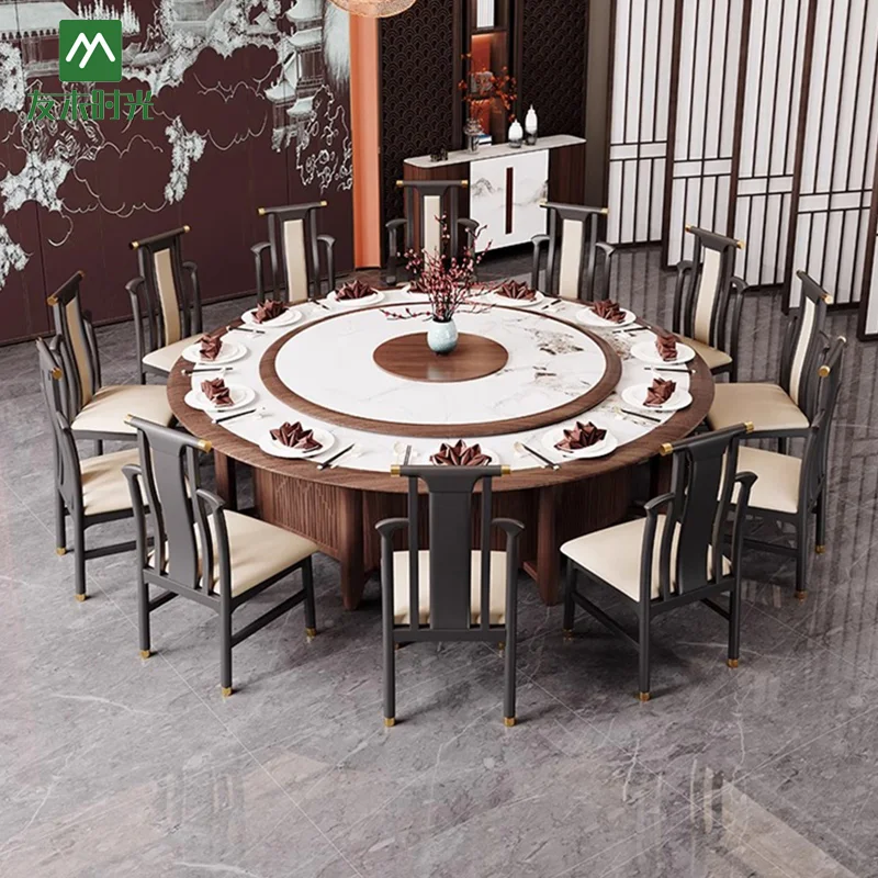 This elegant electric round table and chair set is designed for banquet halls or high-end restaurants. The table features a durable, scratch-resistant, and moisture-resistant high-hardness slate top supported by a sturdy solid wood frame. It also features a swivel function for convenient dining for large groups. Available in a variety of diameters (from 180 cm to 300 cm), this set is suitable for hotel rooms of varying sizes.