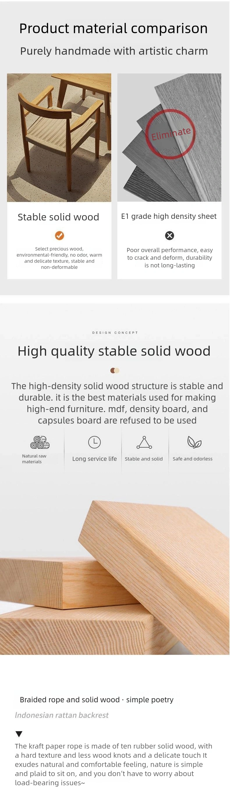 | Table | MCafeulti-layered plywood tabletop + solid wood table legs |