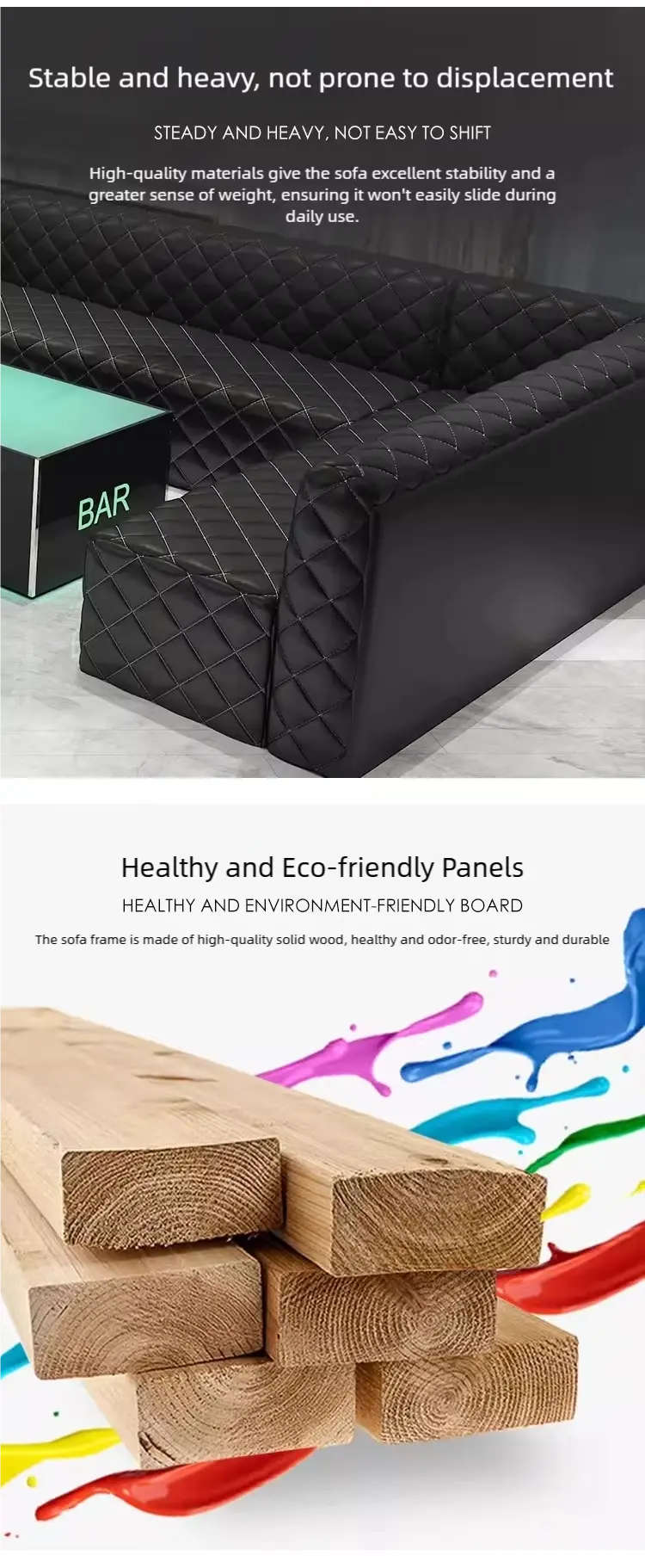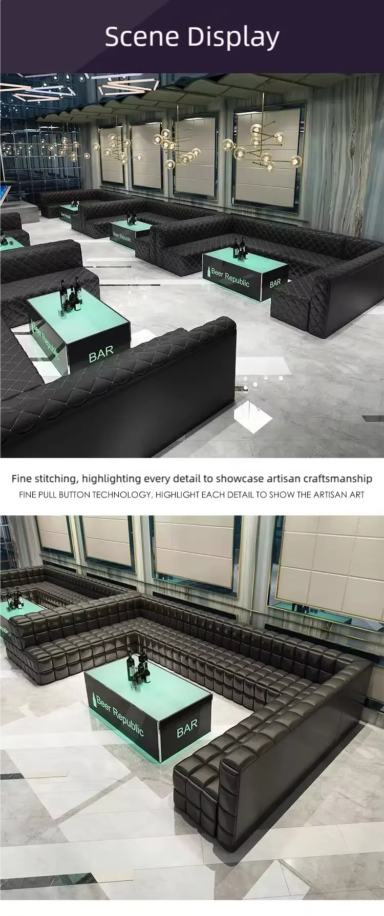 Perfect for modern entertainment and leisure spaces: This KTV bar furniture set is designed for bars, KTVs, and lounges. The combination of black leather sofas and LED coffee tables creates a stylish, vibrant, and engaging nightlife atmosphere.