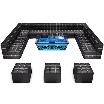 Perfect for modern entertainment and leisure spaces: This KTV bar furniture set is designed for bars, KTVs, and lounges. The combination of black leather sofas and LED coffee tables creates a stylish, vibrant, and engaging nightlife atmosphere.