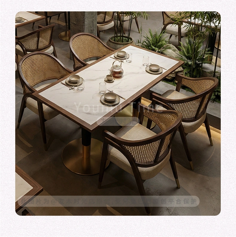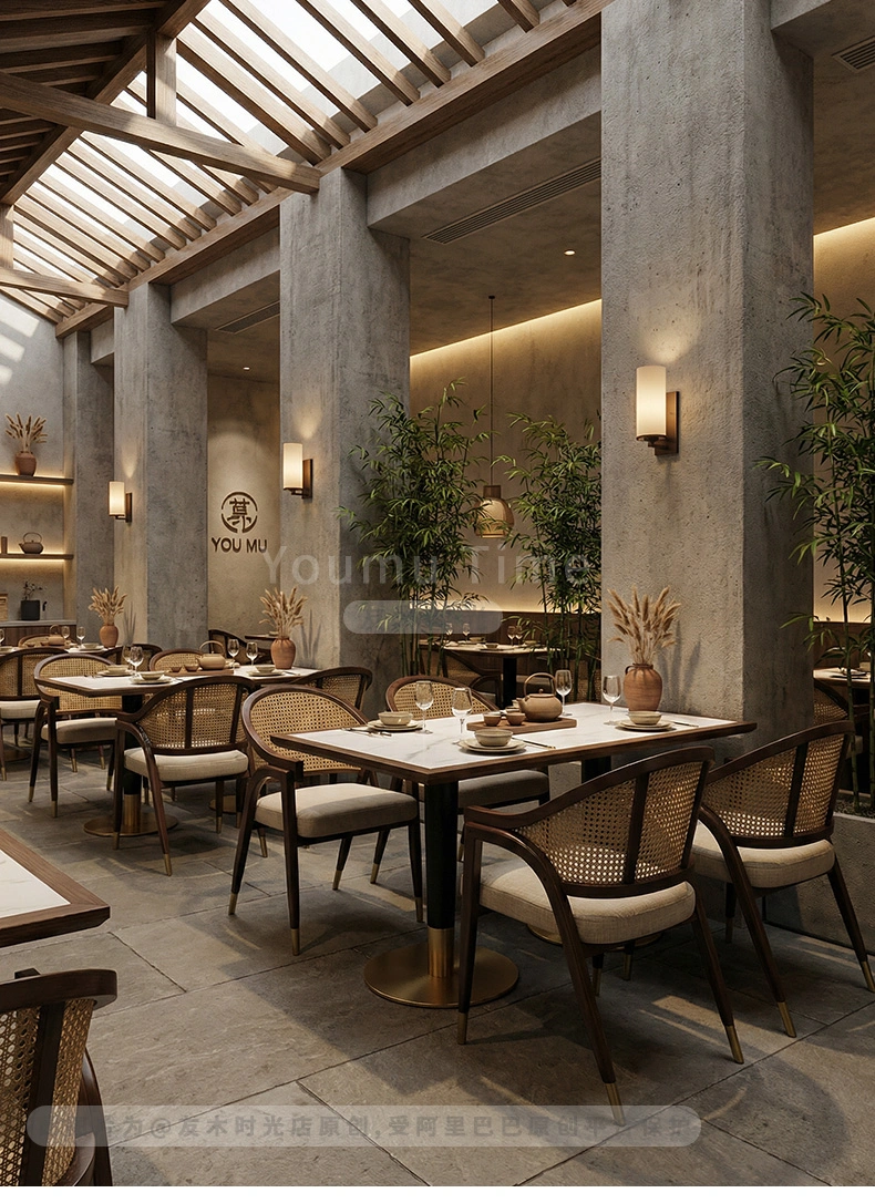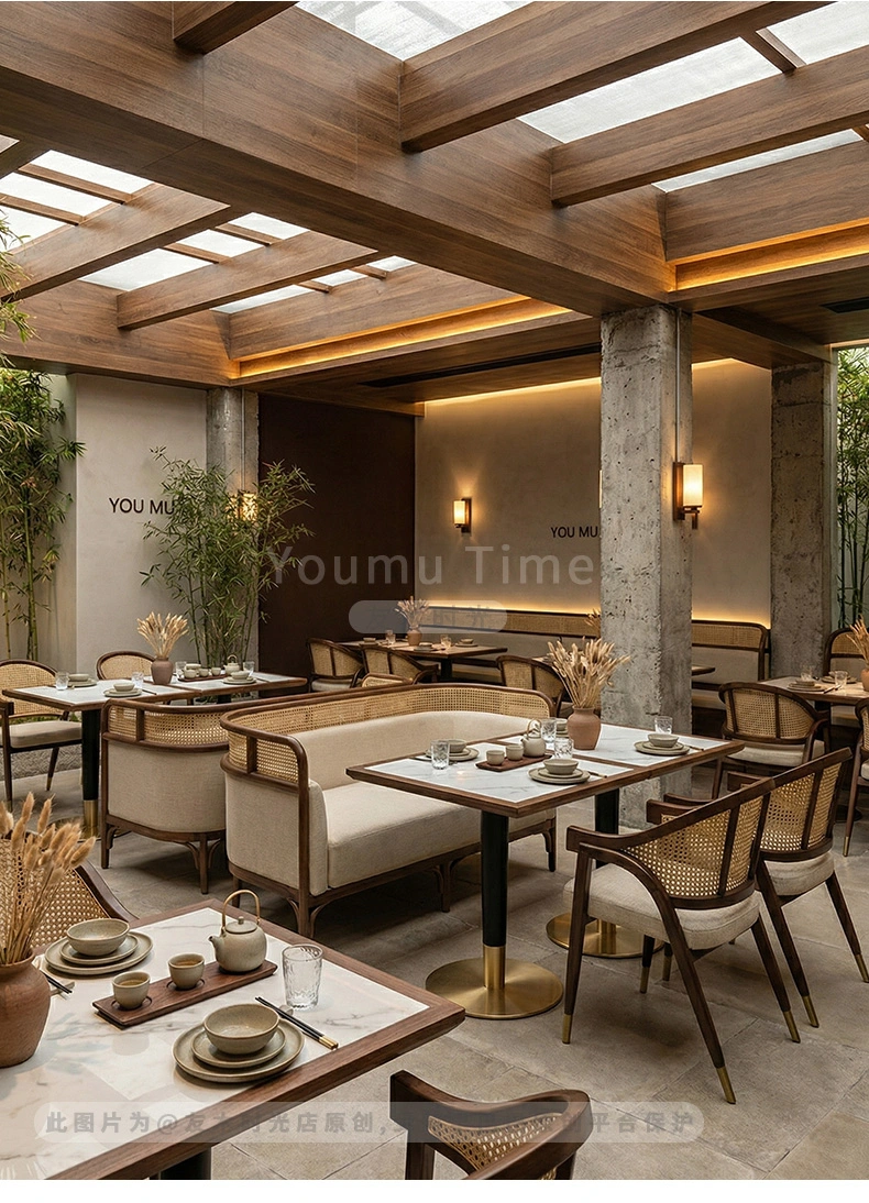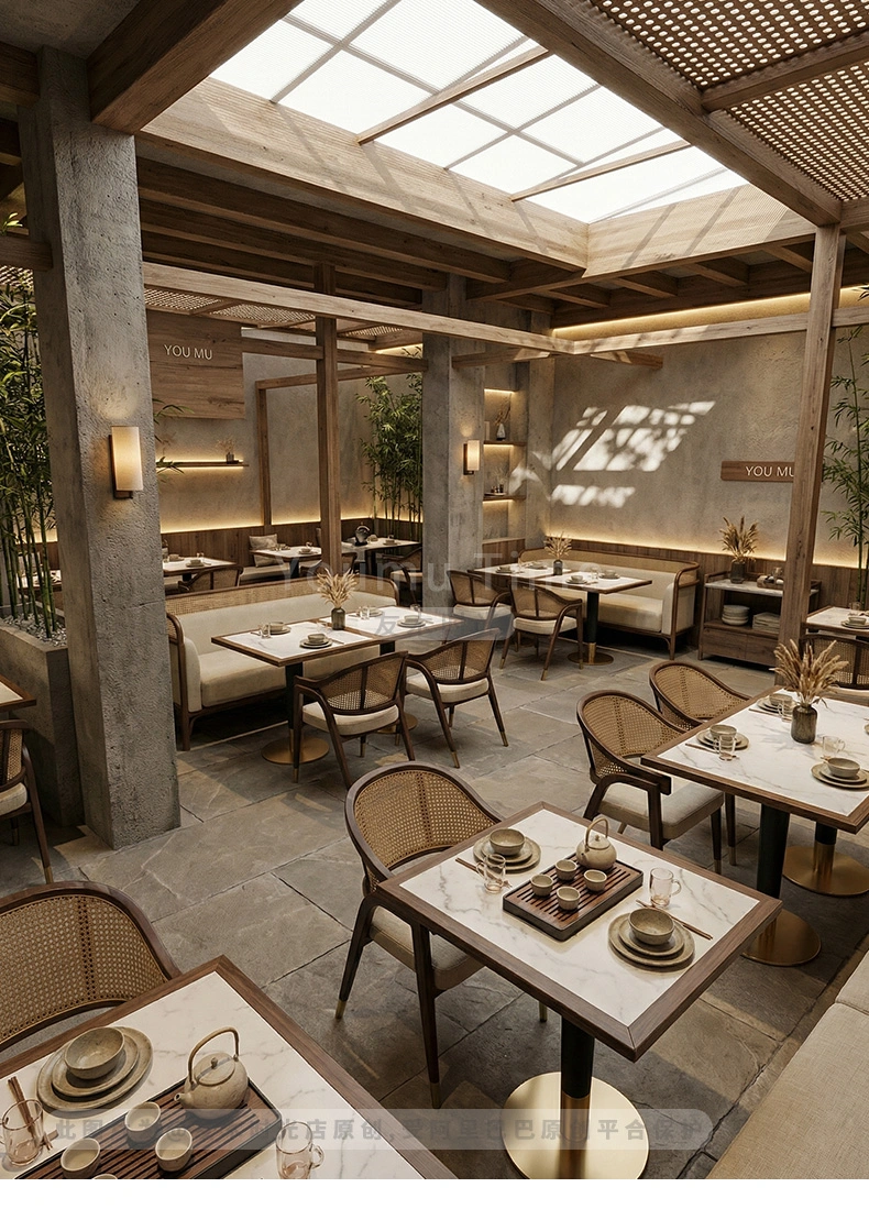 Wholesale high-end restaurant furniture. This set is suitable for both Chinese and Japanese restaurants, combining elegance and practicality. The design concept balances minimalist Japanese elegance with refined Chinese elements, creating a perfect setting for upscale restaurants, tea houses, and noodle shops.