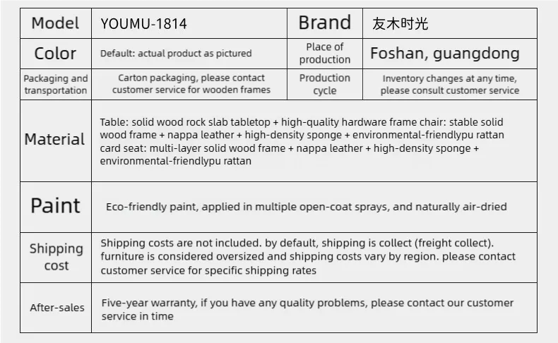 | Chair | solid wood frame+ skin-friendly Nappa leather wrap + high-density rebound sponge |