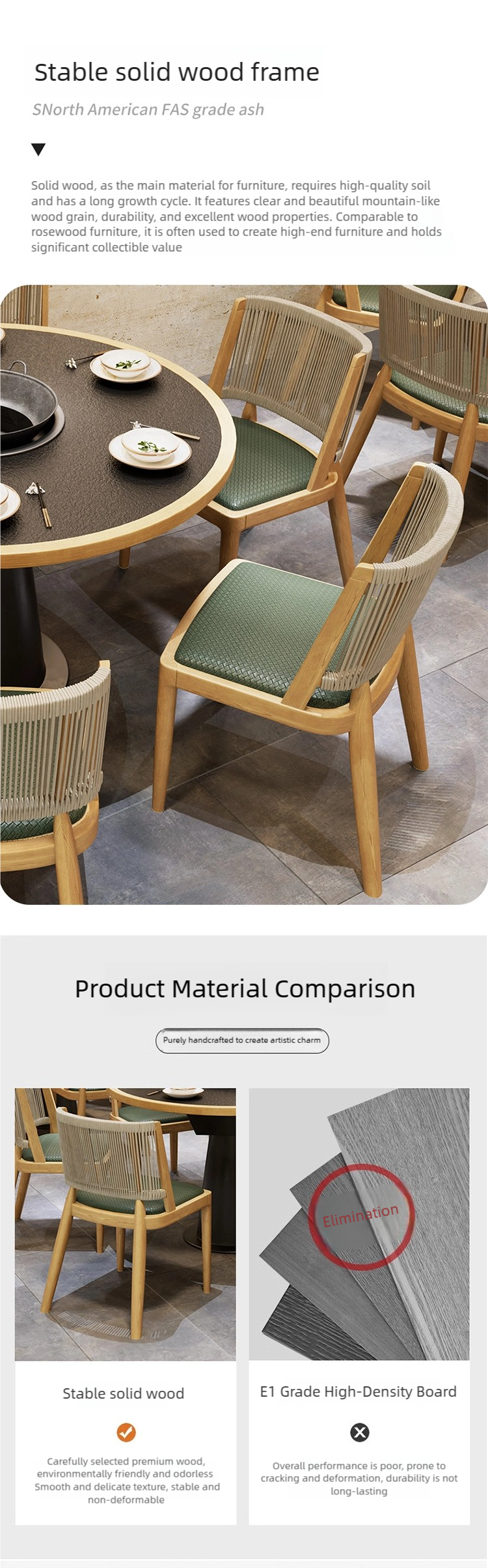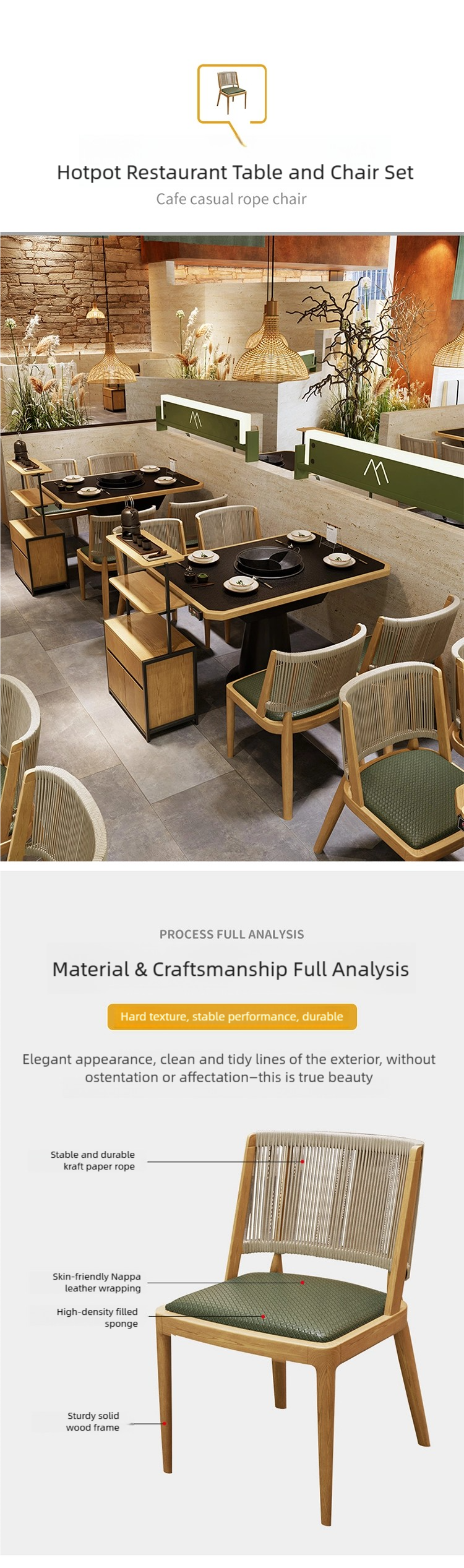 - Unique Craftsmanship and Material Advantages: A sturdy, solid wood frame, leather/fabric upholstery, high-density foam, and durable paper rope weaving add a unique sense of leisure and natural texture to the restaurant space.