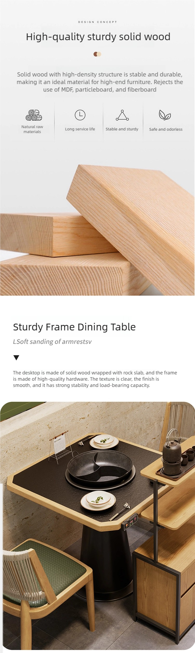| Table | Solid wood veneer tabletop + high-quality hardware legs |