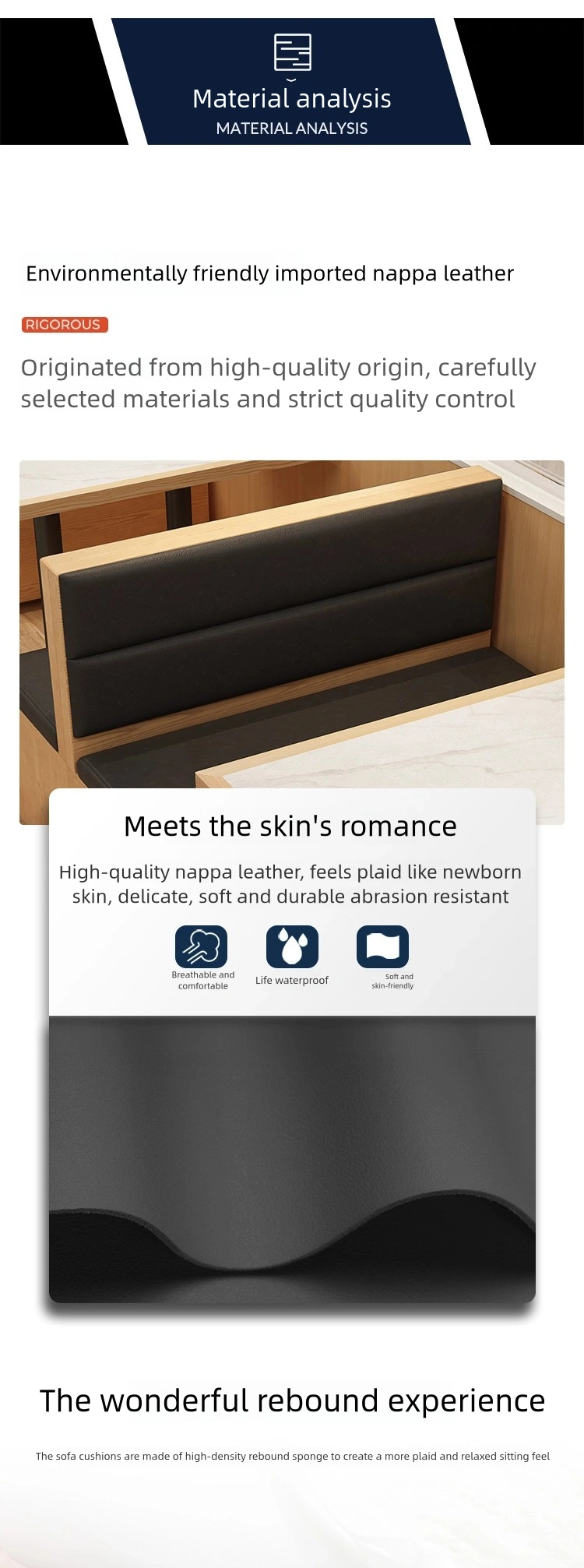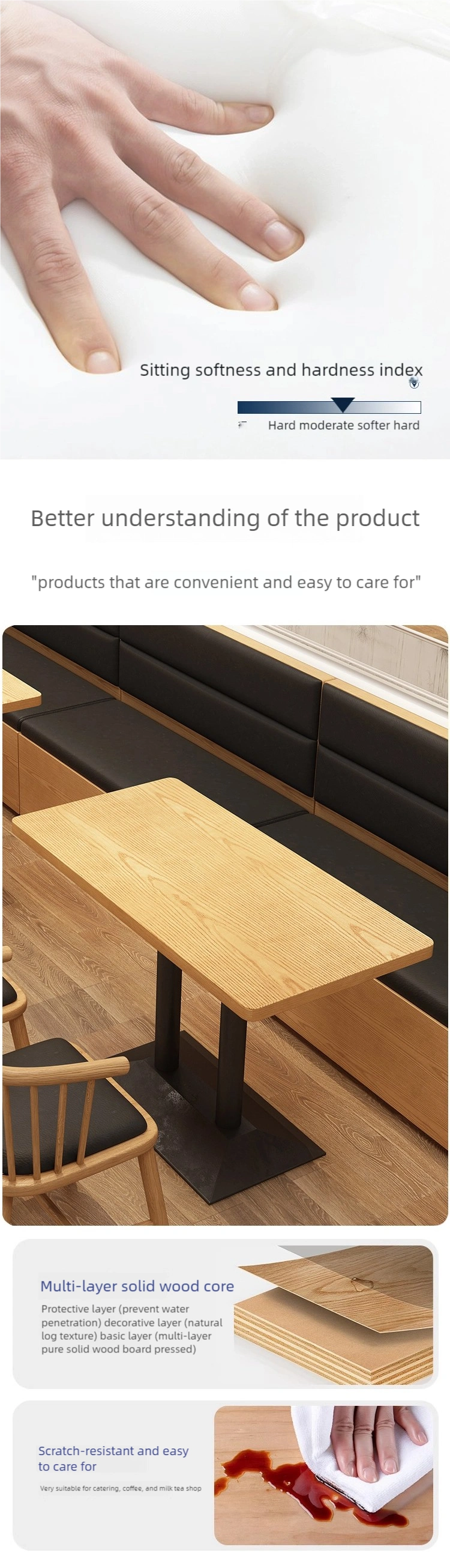 | Booth | Multi-layer solid wood frame + skin-friendly Nappa leather wrapping + high-density rebound sponge |