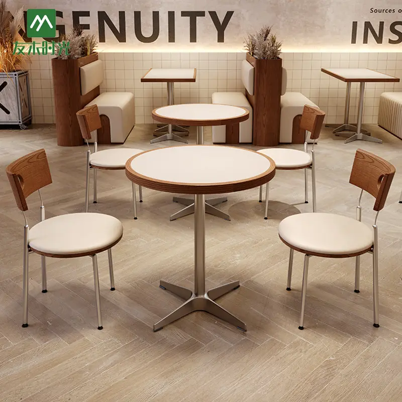 Modern Minimalist Style: Our wholesale restaurant table and chair sets feature clean, geometric lines. The color scheme features beige, wood, and light brown accents with metallic silver accents, creating a bright, modern look perfect for restaurants and cafés.
