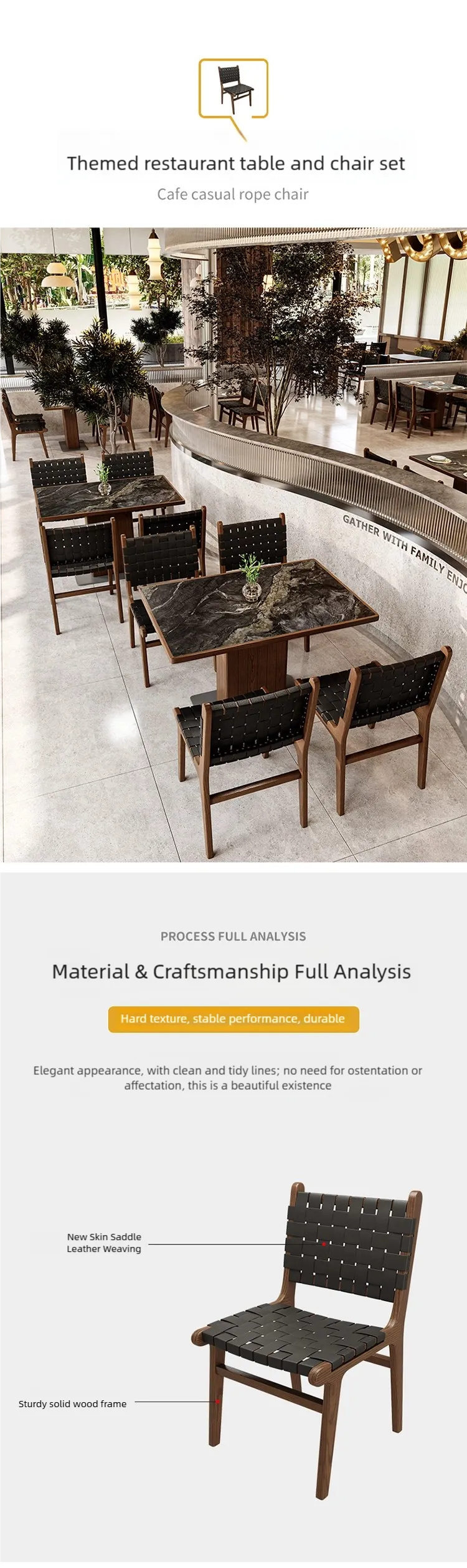 Wholesale walnut-color restaurant furniture for commercial spaces. The interaction between the woven cushion and the marble-like rock slab material injects a flowing sense of luxury into the space. It is not only a set of furniture, but also a visual label of your store’s style, specially customized for boutique Western restaurants, resort hotels, and high-end private kitchens. Bulk orders are welcome.