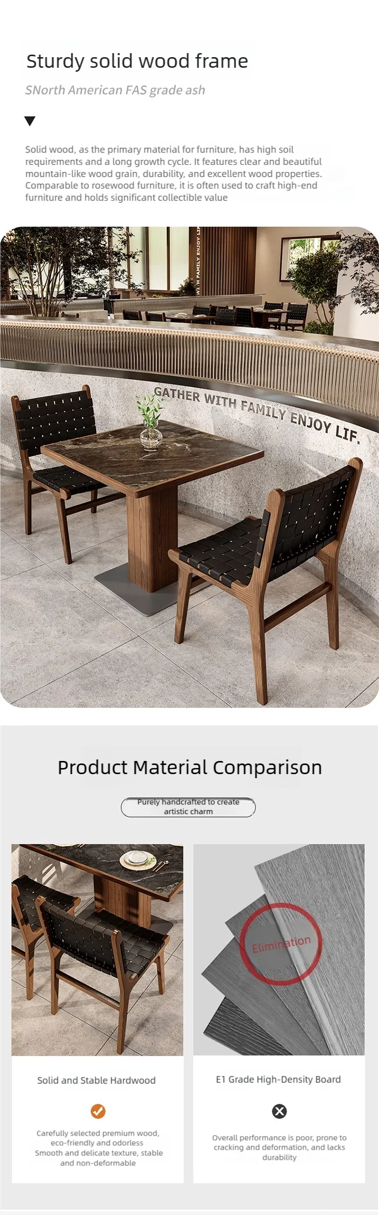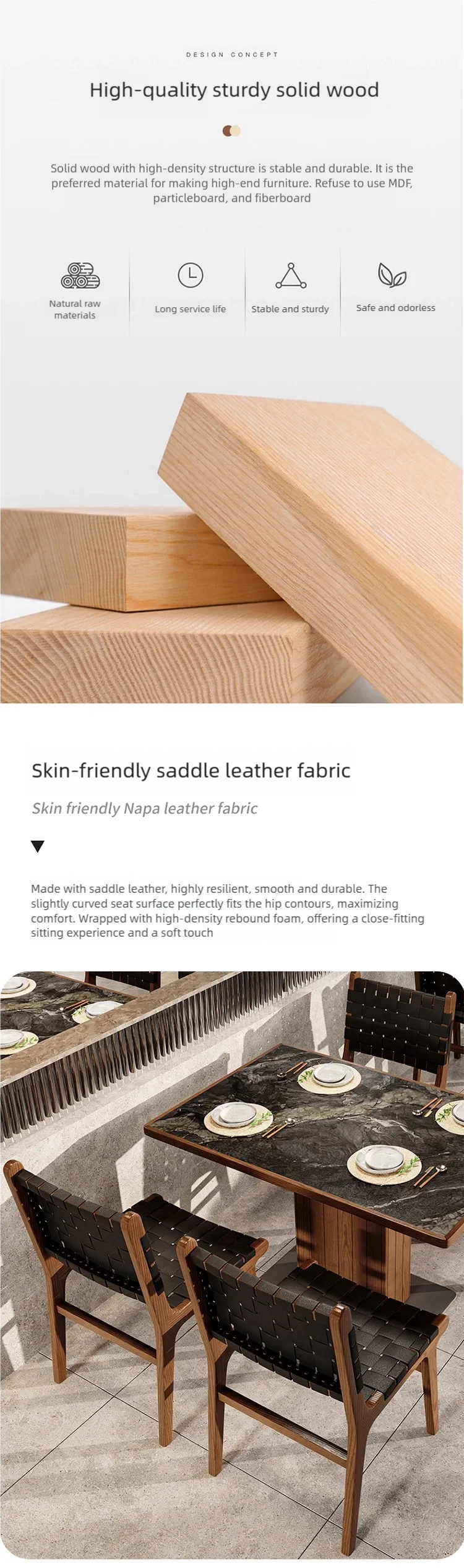 Luxury Appearance of Desktop: It is made of solid wood wrapped with a rock slab. This high-quality stone material can significantly enhance the overall decoration texture of the dining space compared to warm natural wood materials.