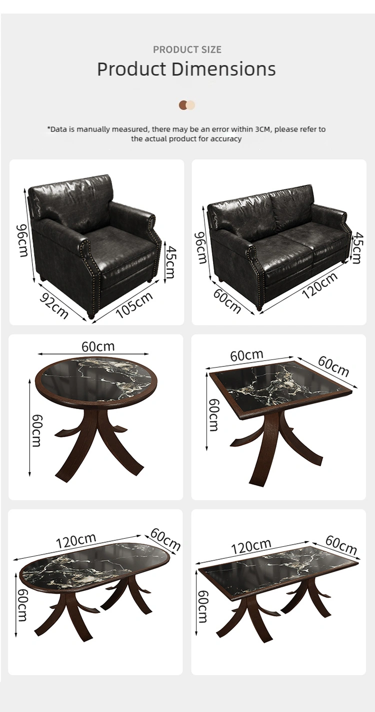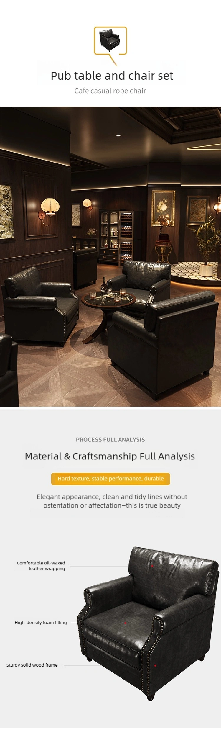 Wholesale vintage-style pub furniture set, including comfortable sofas and solid wood tables. Thick, soft cushions and wide armrests, upholstered in high-quality black leather, provide an unparalleled seating experience. OEM and ODM are supported. Contact us for a quote.