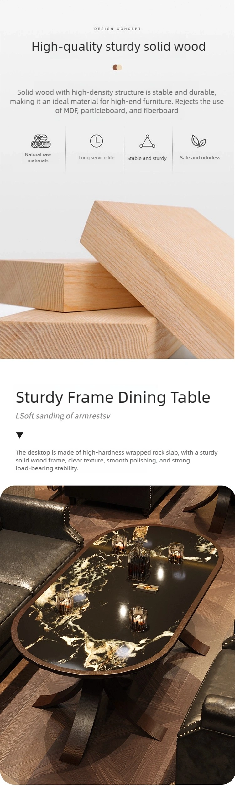 | Table | Solid wood veneer tabletop + solid wood table legs |