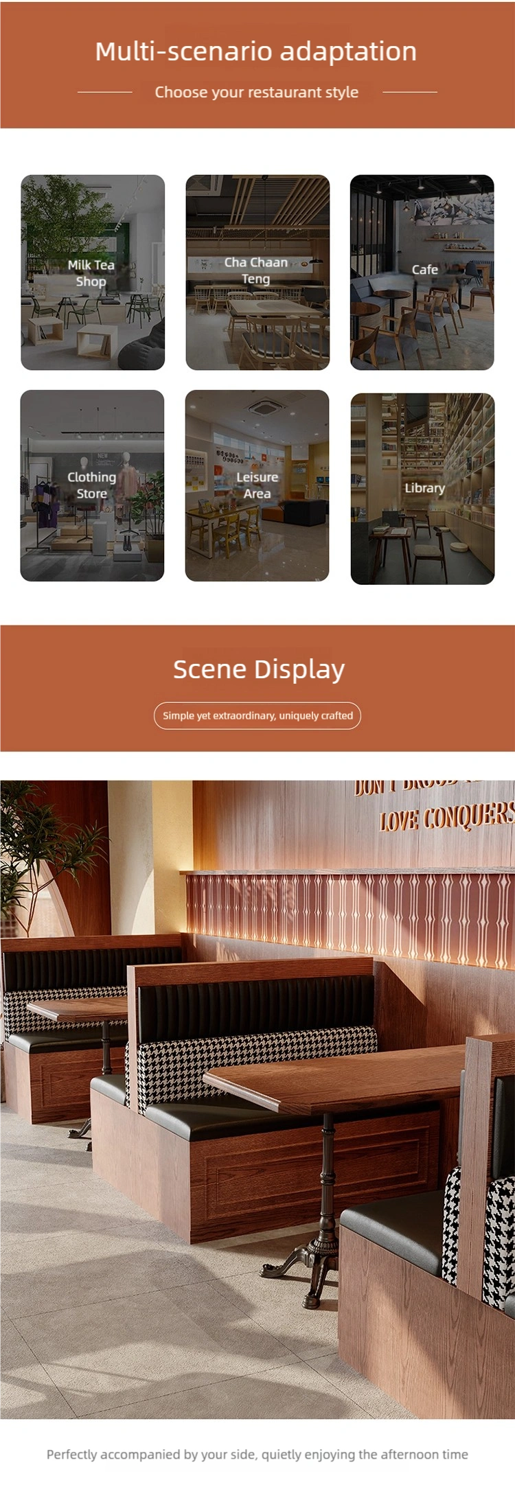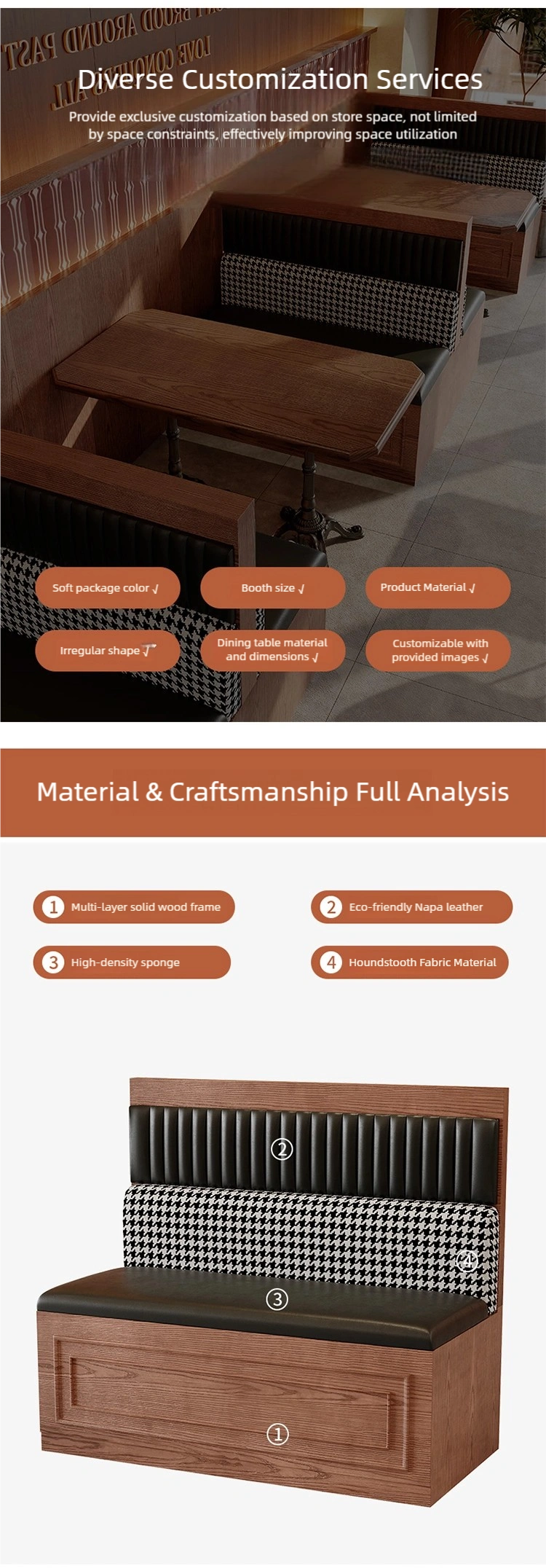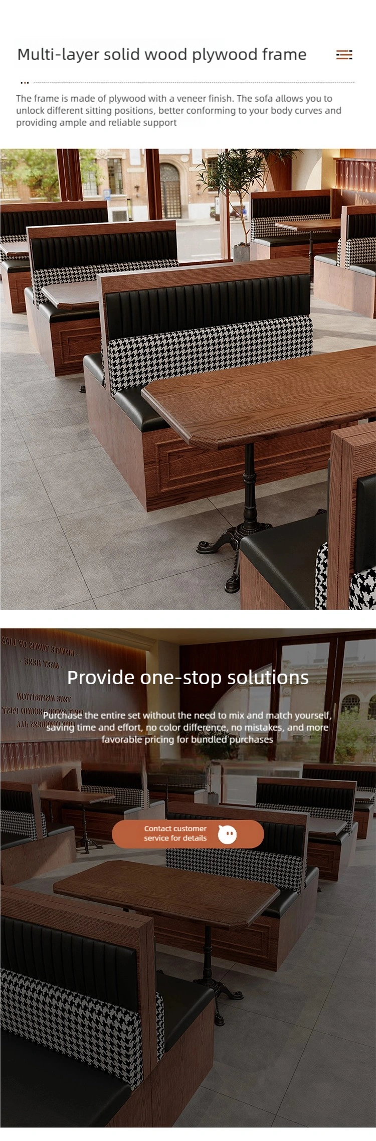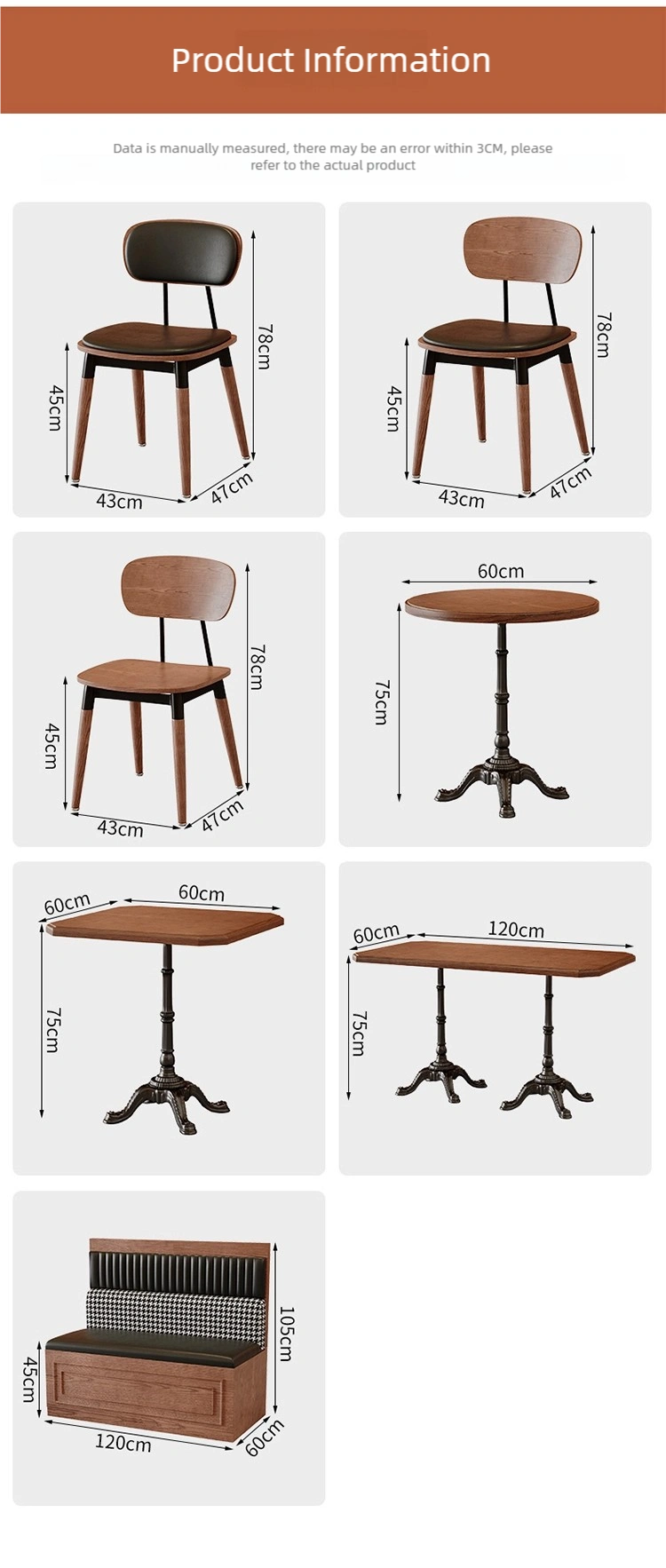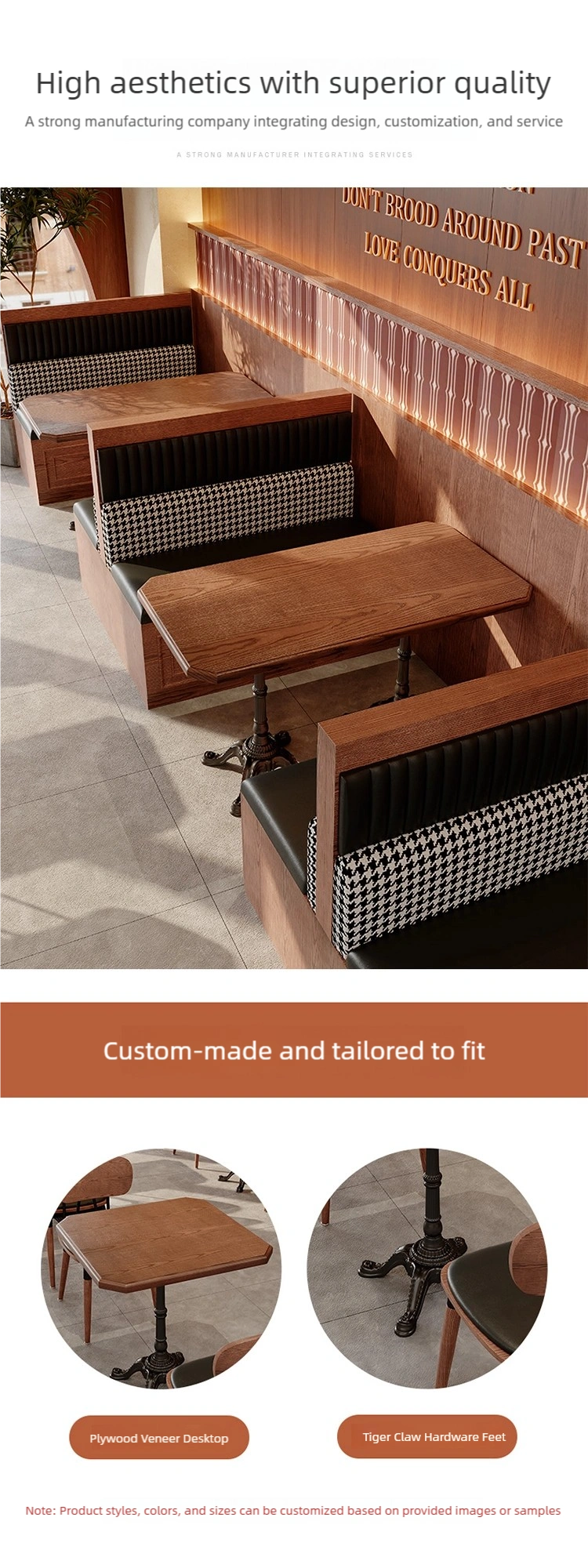 Wholesale restaurant safety cornering table, retro chairs, and vintage booths. This series combines the rugged industrial cast iron aesthetic with the warm Nordic solid wood texture, with classic houndstooth elements and dark walnut tones complementing each other. It is designed for commercial spaces that pursue style and quality (coffee shops, Western restaurants, high-end hotels). Bulk orders are welcome.