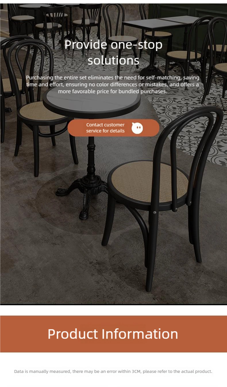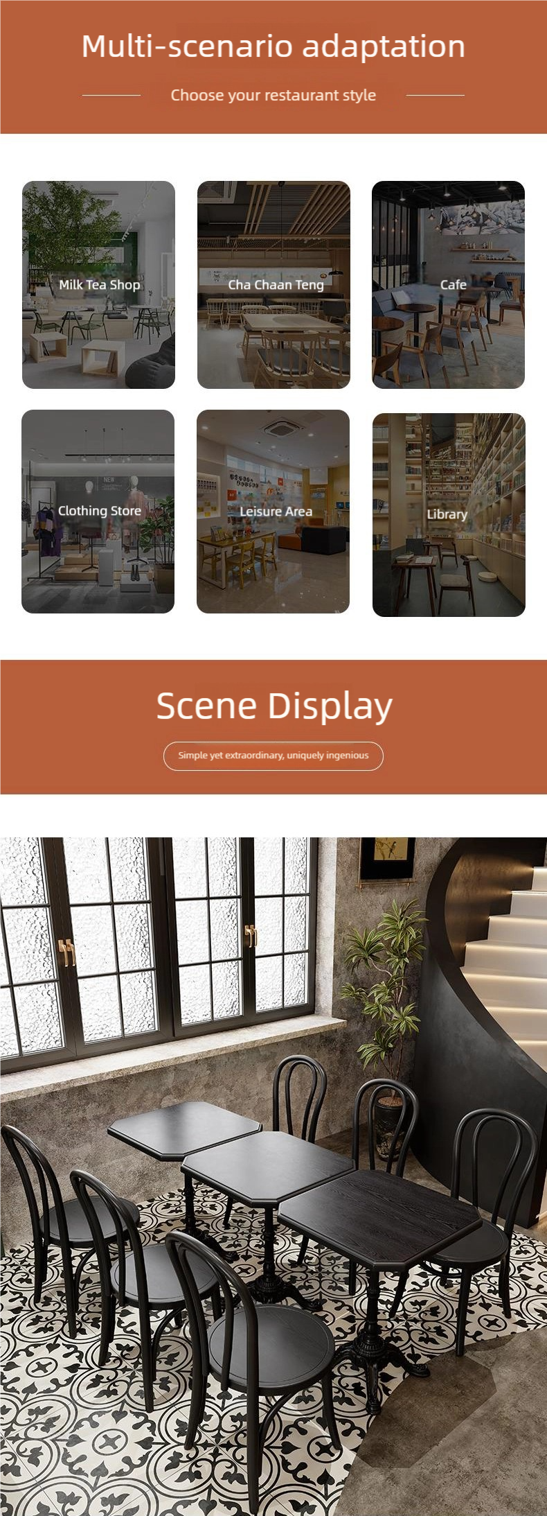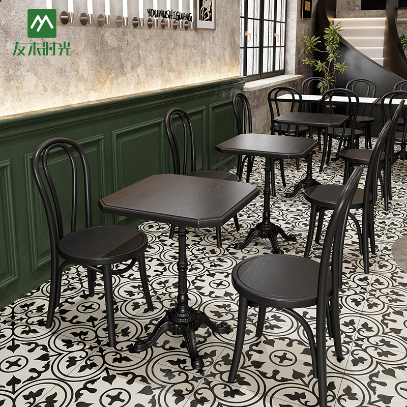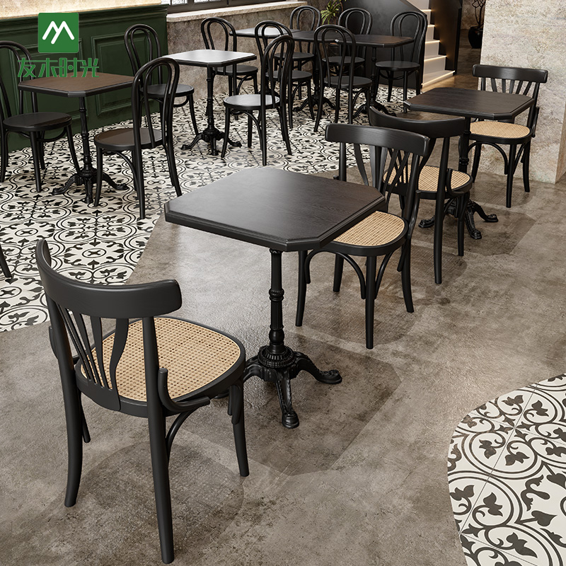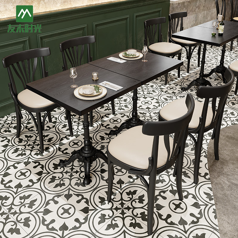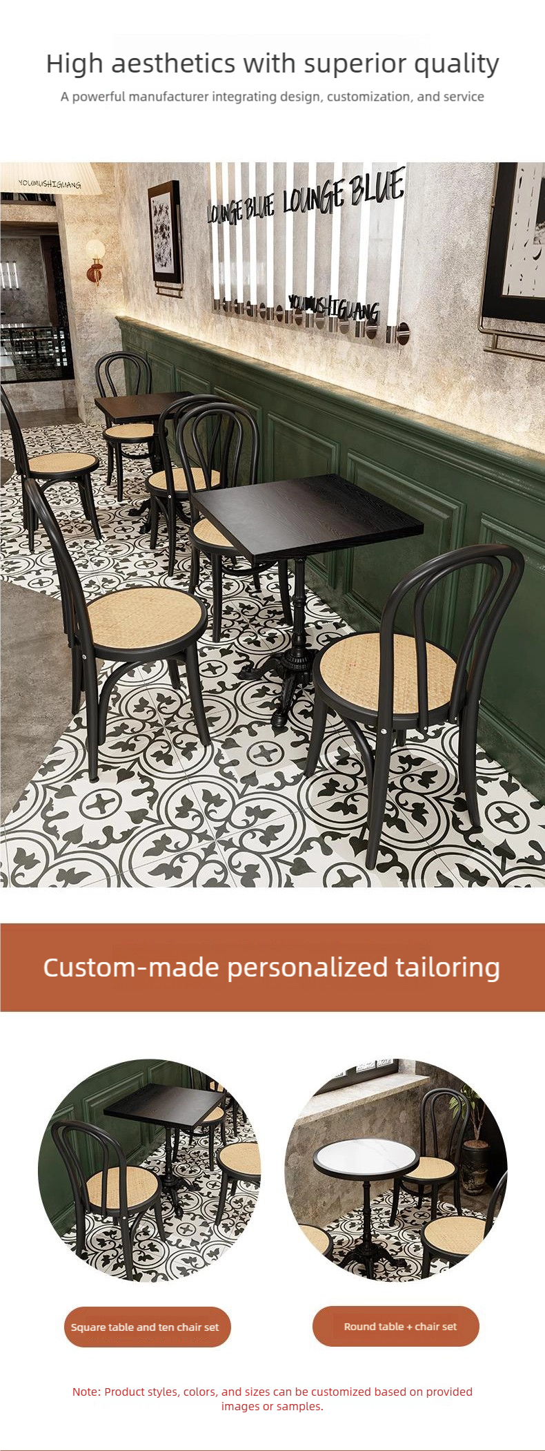 Wholesale classic vintage-style restaurant table and chair sets, bringing the charm of classic European cafes into your home or commercial space. The matching tables feature sturdy and elegant black cast iron bases, providing unparalleled stability and adding a touch of vintage elegance. This series is ideal for European-style and themed cafes. Contact us for a quote.