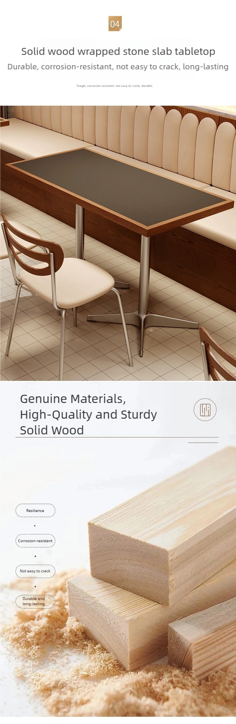 Robust Tabletop: The dining table features a solid wood wrapped stone slab tabletop, combining the warm texture of solid wood with the corrosion resistance, crack resistance, and durability of stone, making it suitable for various scenarios, including coffee and hot food.