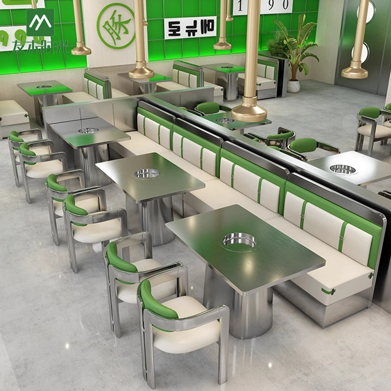 Durable stainless steel hot pot table & chair sets with built-in hot pot slots, ergonomic seating, space-saving layout, and modern industrial design.