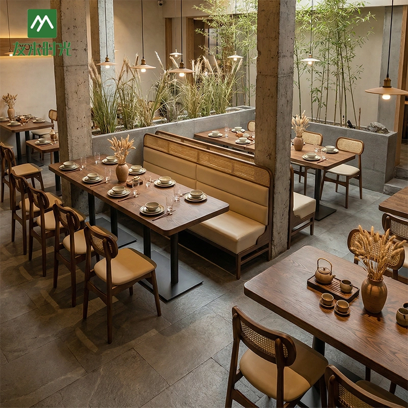 Wood-texture furniture helps create a strong emotional connection between the customer and the dining concept, reinforcing brand storytelling and enhancing perceived authenticity. It transforms the restaurant space into an experience-driven environment rather than just a place to eat.