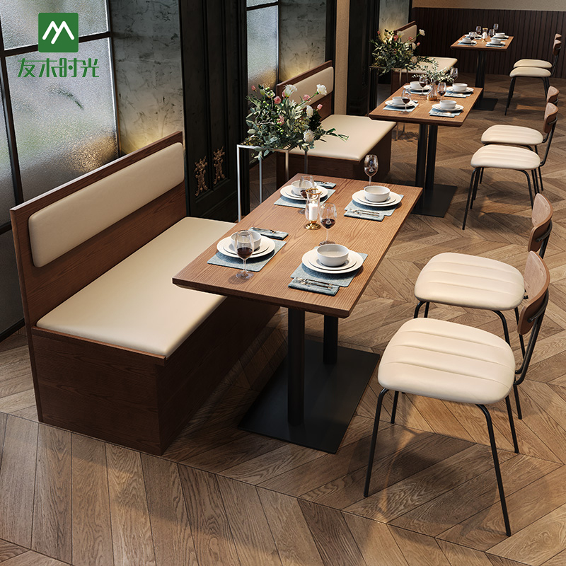 Bulk coffee shop furniture wholesale, sample, and retro style. Dark wood/black metal contrasts sharply with soft, light-colored upholstered seating, creating a sophisticated and striking balance. Perfect for themed restaurants and cafes. Contact us for wholesale pricing.