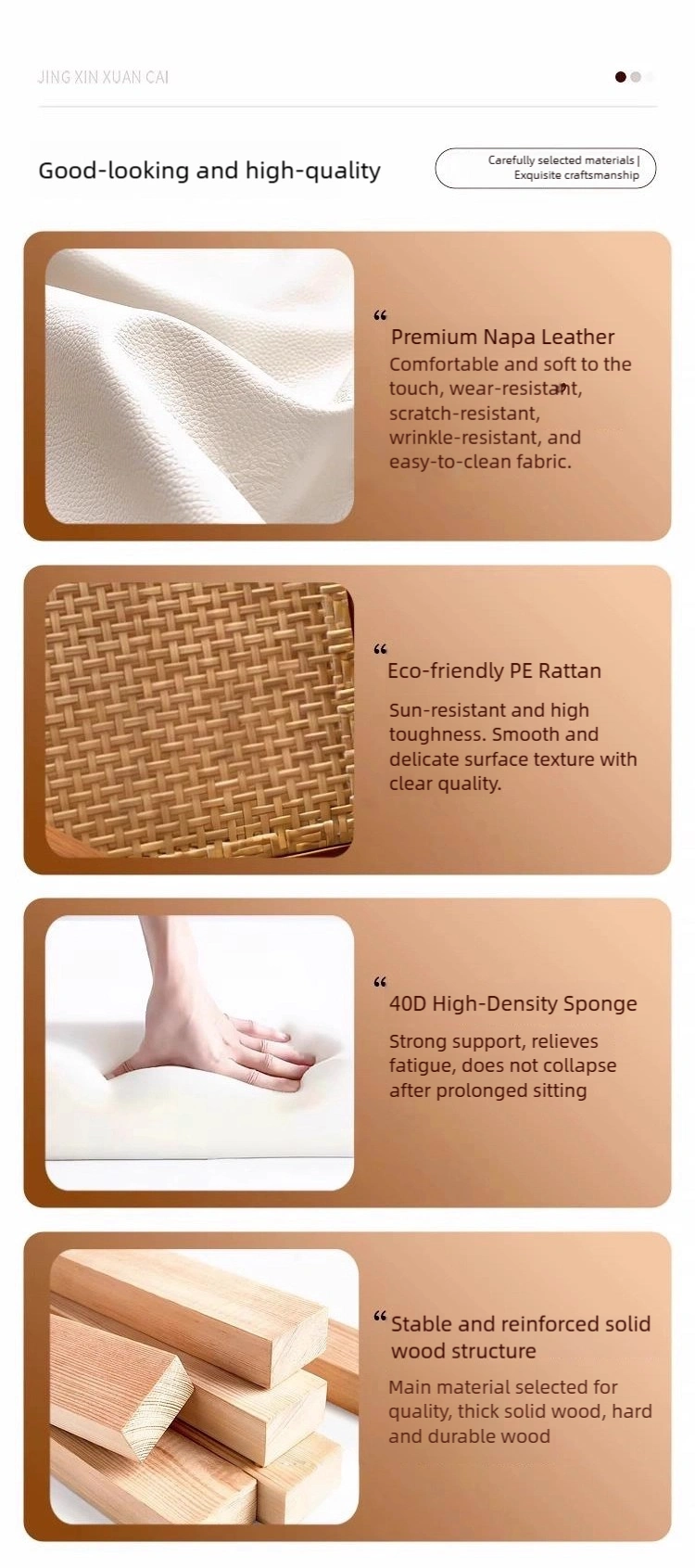 | Кресло | Solid wood frame + rattan woven backrest + high-density resilient sponge + high-quality scratch-resistant and wear-resistant leather |