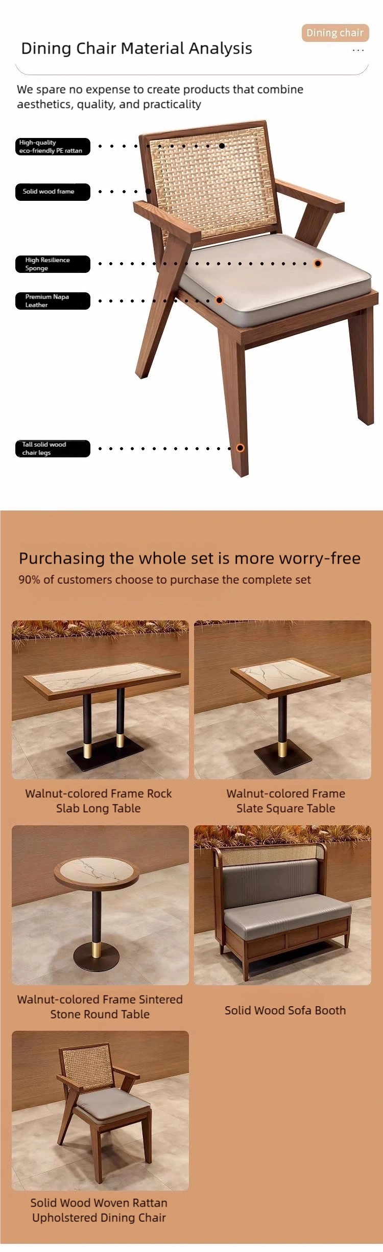 Wholesale Southeast Asian restaurant furniture suitable for commercial spaces. The dining tables feature a Stable and reinforced solid wood structure; the chairs and booths with solid wood woven rattan bring warmth and comfort to your commercial spaces. This product series is ideal for themed restaurants. Bulk orders are welcome.
