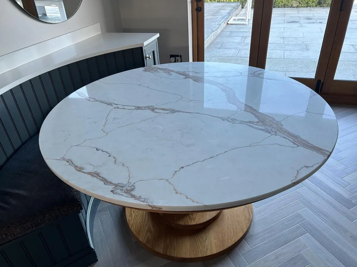 Best for: boutique hotel dining rooms, lobby cafés, and contemporary restaurants seeking a refined stone look with better practicality than marble.
