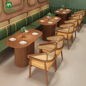 As a high-end restaurant furniture manufacturer and supplier, we focus on providing premium restaurant furniture that combines exquisite aesthetics with commercial durability. This modern restaurant furniture set features warm wood finishes and soft upholstered seating, creating a sophisticated and comfortable dining environment. Specifications of Restaurant Furniture Model 1076 Category Restaurant Furniture Product Name Restaurant Tables…