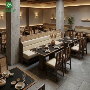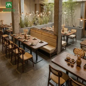 Wholesale high-end restaurant furniture. This set is suitable for both Chinese and Japanese restaurants, combining elegance and practicality. The design concept balances minimalist Japanese elegance with refined Chinese elements, creating a perfect setting for upscale restaurants, tea houses, and noodle shops. We are a restaurant furniture manufacturer. Partnering with us ensures you receive furniture that…