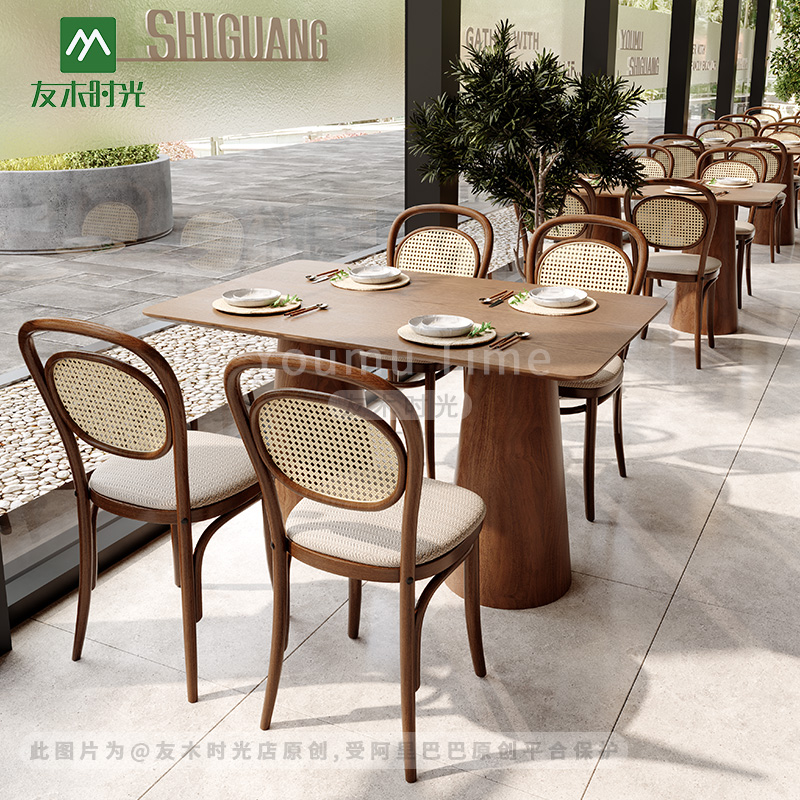 Natural Materials & Layered Textures: Large wooden tabletops preserve authentic wood grain, while the mix of wood, rattan, and fabric delivers multi-sensory texture and rich tactile appeal.