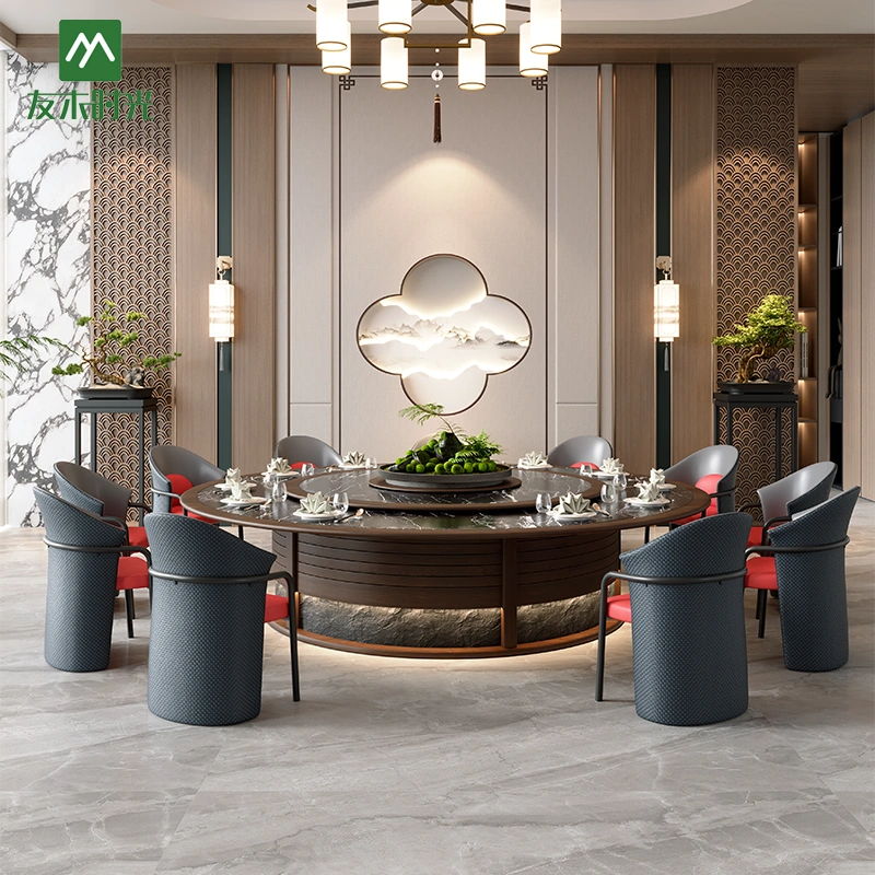 This Private Room Round Dining Table Set features a refined modern Chinese style blended with contemporary elegance. The natural wood finish, clean lines, and soft neutral upholstery create a warm, sophisticated atmosphere. Ideal for private dining rooms, upscale Chinese restaurants, and hotel VIP rooms.