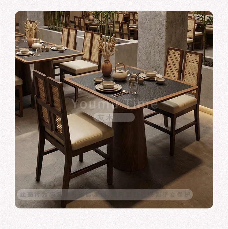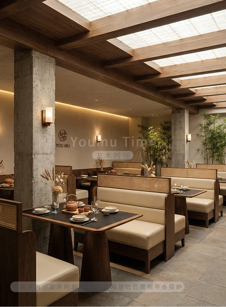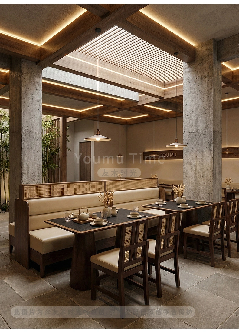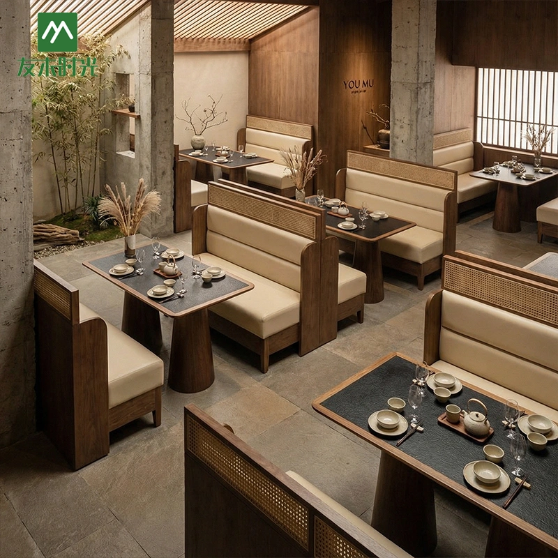 Wholesale restaurant booth seating sets elevate your restaurant and create a high-end dining environment. Inspired by modern minimalism and Japanese interior design, these seating solutions combine natural textures, warm colors, and clean architectural lines to create an elegant and tranquil upscale dining atmosphere. Suitable for high-end tea houses, noodle shops, Chinese restaurants, and Japanese restaurants.