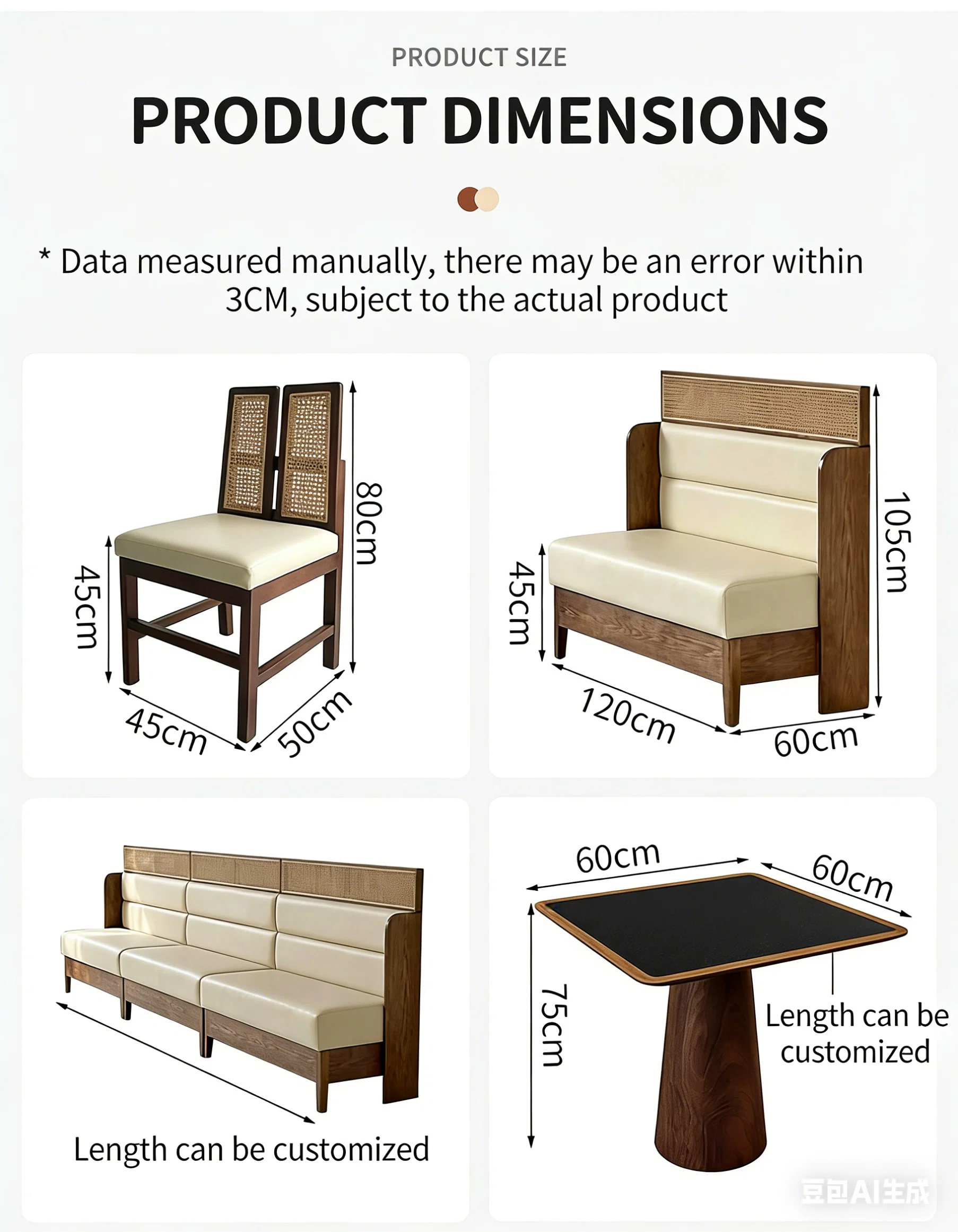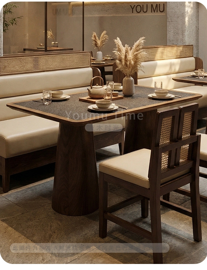 - High-End Minimalist & Japanese-Inspired Style: The wholesale restaurant booth seating sets combine modern minimalist principles with delicate Japanese aesthetics, emphasizing clean architectural lines, balanced proportions, and natural materials to create a tranquil and refined visual effect.