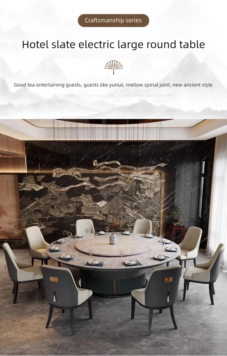 Wholesale high-end hotel electric round banquet tables, equipped with smooth-rotating turntables and matching chairs. These tables are luxuriously designed for comfort and convenience, allowing guests to easily share food, and are perfectly suited for Chinese, Japanese, Korean, and international fine dining events. Contact us for a quote.