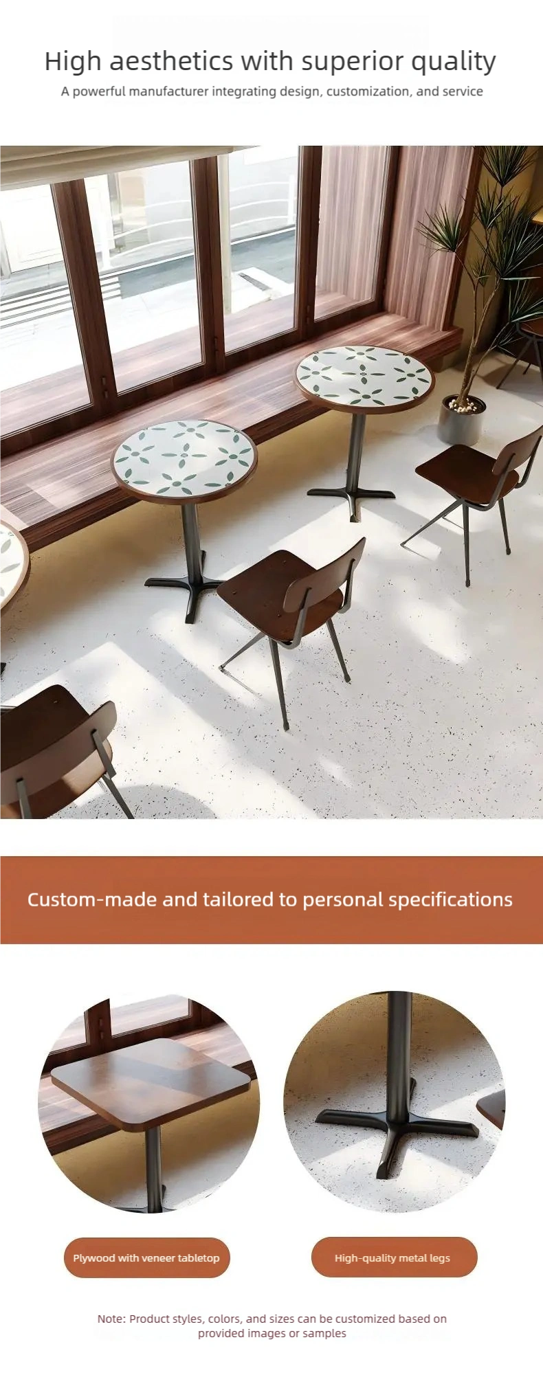 This set of café furniture is renowned for its minimalist aesthetic, balancing both form and function. It offers a high degree of flexibility to business owners seeking to maximize their floor space without sacrificing style. Contact us for a factory price.