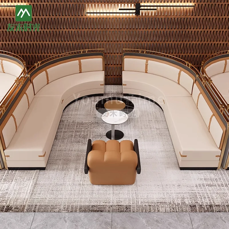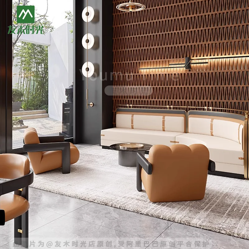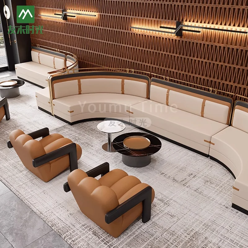 Wholesale reception area furniture. This commercial furniture set creates an elegant and memorable first impression in high-end spaces such as corporate reception areas, luxury hotel lobbies, executive offices, and lounges, while ensuring a harmonious, sophisticated, and comfortable waiting environment for customers. The set includes a curved sofa, comfortable single sofas, and stylish coffee tables, providing a complete reception area solution. Contact us for a quote.